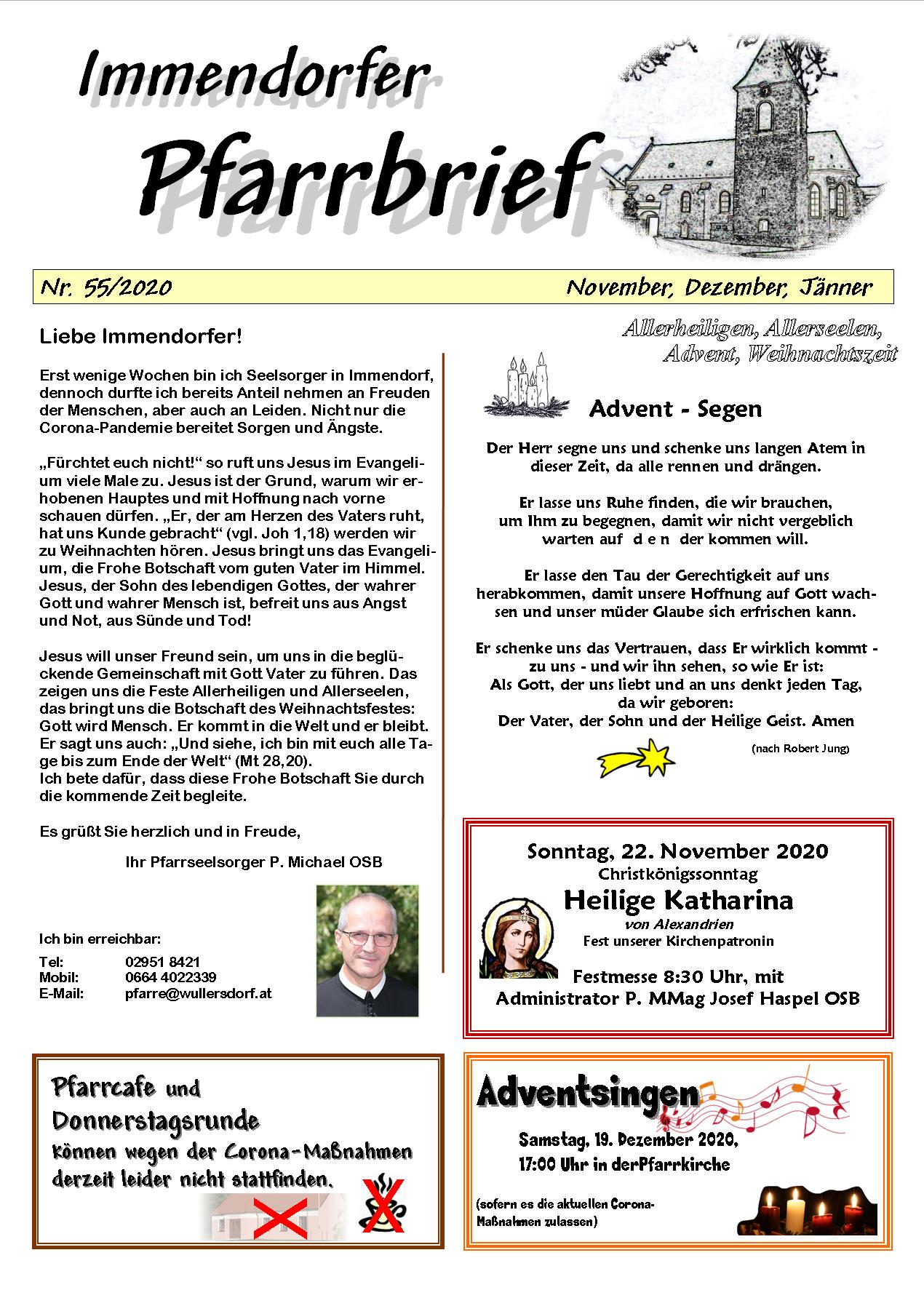 Der neue Pfarrbrief für die kommenden drei Monate ist fertig. Einige Termine und Veranstaltungen sind wegen der "Corona-Maßnahmen" leider gar nicht möglich, manches ist geplant. Ob es zu weiteren Einschränkungen bei Gottesdiensten kommen wird, ist abzuwarten. Wir müssen achtsam und flexibel bleiben.