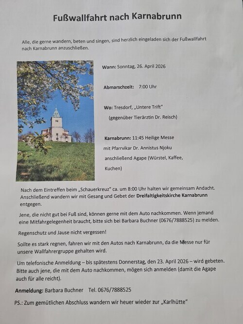 Herzliche EInladung zur Fußwallfahrt von Tresdorf nach Karnabrunn. Treffpunkt ist in Tresdorf "Untere Trift" um 7.00 Uhr. Ankunft in Karnabrunn um ca. 11.45 Uhr, danach heilige Messe mit Pfarrvikar Annistus Njoku. Zur Stärkung gibt es danach eine Agape (Würstel, Kaffee und Kuchen).