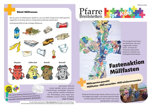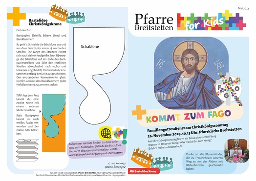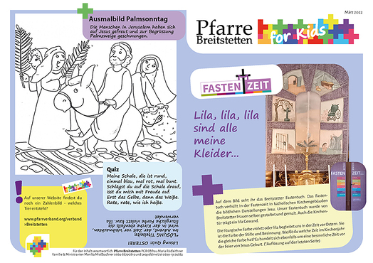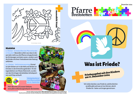 Pfarre Breitstetten FOR KIDS in Wort und Bild - das ist der Kinderbote, den wir alle 2-3 Monate für Kinder von 0-10 Jahren gestalten. Bunt verpackt gibt es Kurznachrichten aus der Pfarre, Informationen zum nächsten Familiengottesdienst und dazu passende Lieder, Rätsel, Tipps und mehr zu entdecken. Hier gibt es die letzten Ausgaben zum Nachlesen.