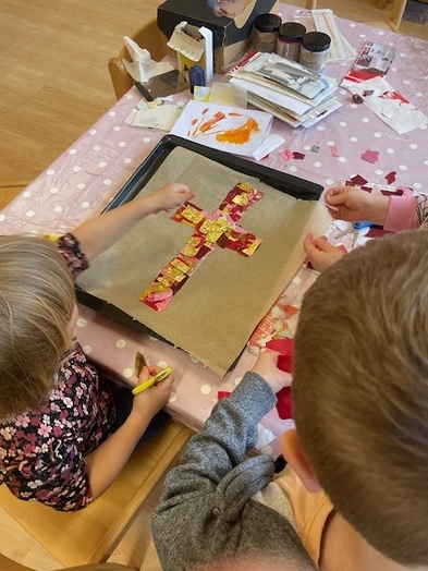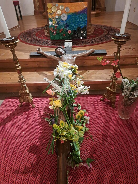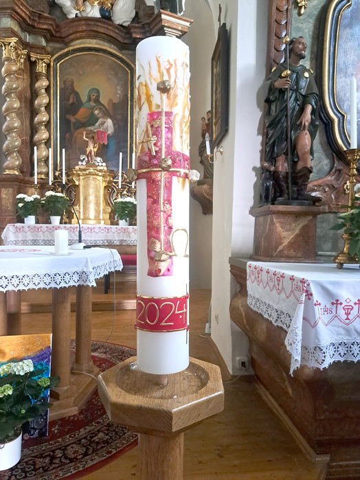 Das Hauptelement der Osterkerze wurde auch dieses Jahr wieder vom Kindergarten gestaltet. Aus Wachsplattenresten entstand ein farbenfrohes Kreuz.