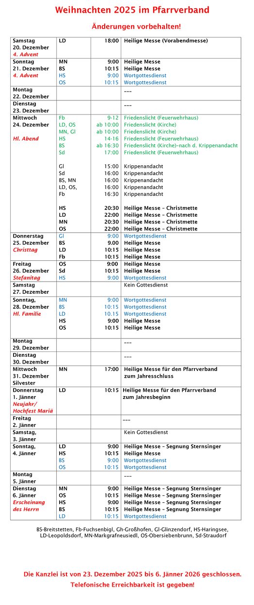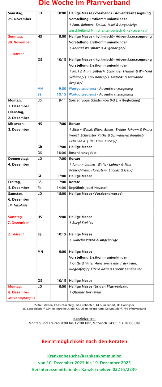 Den Wochenplan für den Pfarrverband können Sie hier nachlesen oder als Zusendung per E-Mail bestellen: leopoldsdorf@pfarrverband.org