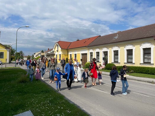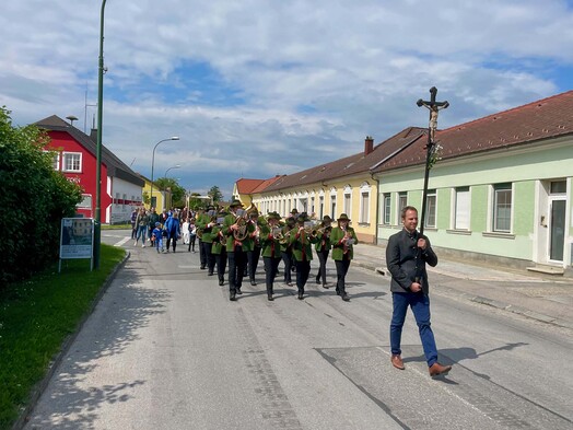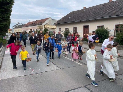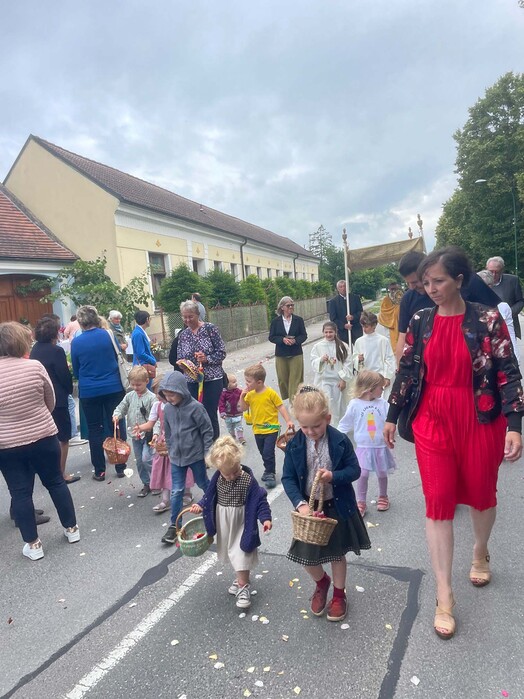 Nach der feierlichen Messe in der Pfarrkirche begleiteten Erstkommunions- und Blumenkinder, die Pfarrgemeinde, Musikverein und Feuerwehr Pfarrer Gregor mit dem Leib Christi durch die Ortschaft zu den vier Altären der Familien Gottschlich, Burger, Forstner und Votzi Richard. Danke an alle für Mithilfe und MItfeiern!