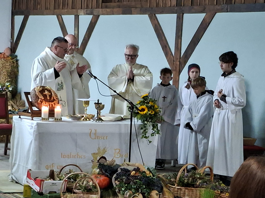 Erntedank - Dank sagen. Der Pfarrverband feierte gemeinsam in Fuchsenbigl und wie immer war der Festzug der Erntewagen ein besonderes Erlebnis. Pfarrvikar Ladi Strus wurde nach der Festmesse in der Halle der Fam. Skladany feierlich in die Pension verabschiedet. Wir wünschen ihm alles Gute und Gottes Segen für seinen Ruhestand.