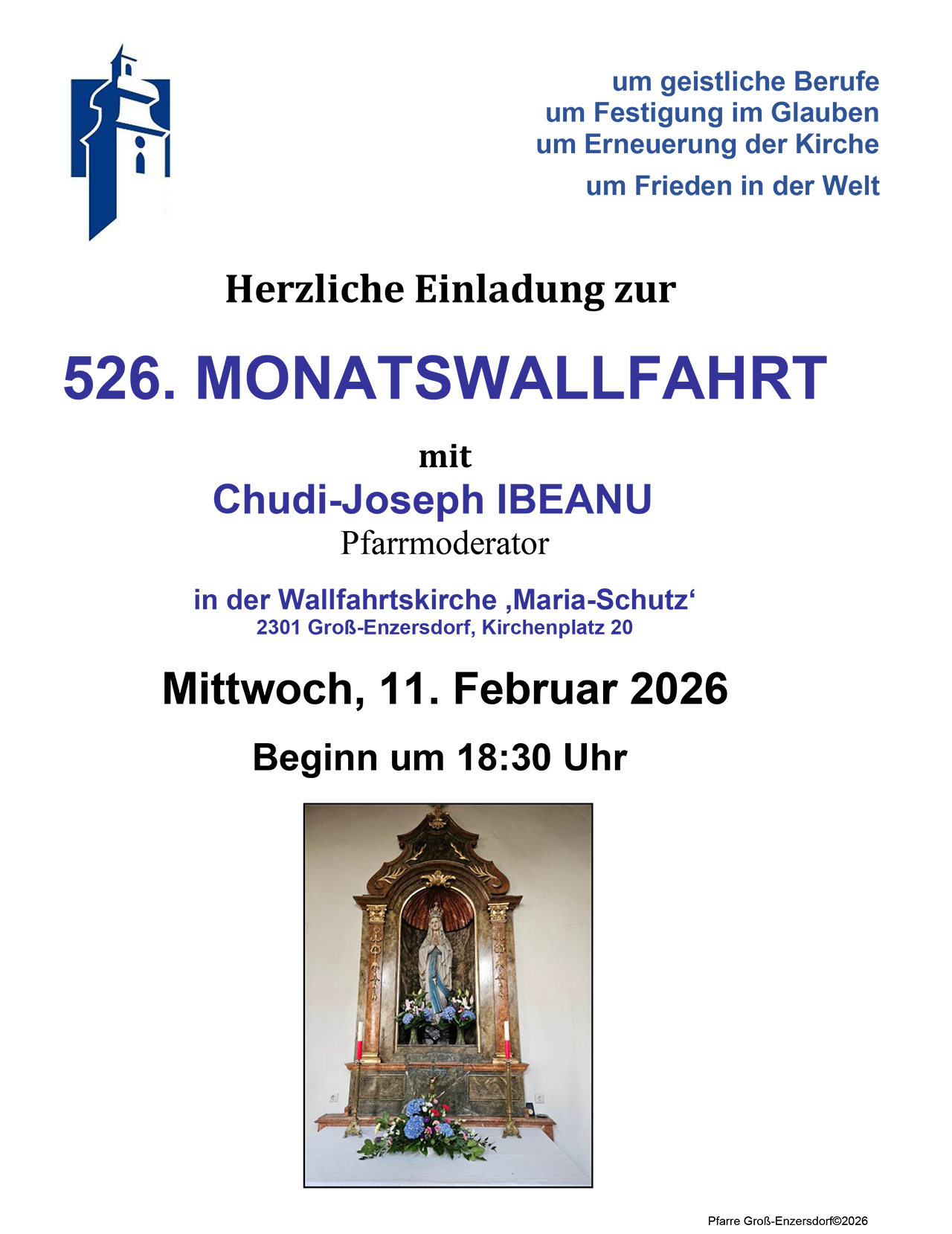 Schon in alten Pfarrchroniken wird berichtet, dass es eine rege Wallfahrtstätigkeit zu der Gnadenstatue von „Maria Schutz“ gegeben hat. Durch die Säkularisierung unter Joseph II. kam diese jedoch zum Erliegen. 1981 führte Pfarrer Franz Fischer auf Empfehlung des damaligen Erzbischofs von Wien, Kardinal Franz König, am 11. Mai die Monatswallfahrt zu Ehren der Gottesmutter in unserer Pfarre ein.