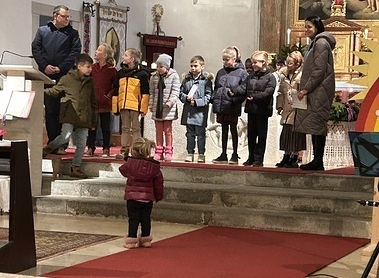 Die 2. Adventsonntagsmesse wurde mit rhythmischen Liedern untermalt. In einem bunten Heftchen waren Texte, Lieder und der Ablauf zusammengestellt. Ein großer auf einem Holzgestell dargestellter Regenbogen, zum Motto" Mit Jesus ist dein Leben bunt!" trägt die Namen und Bilder der acht vorgestellten Erstkommunionkinder.