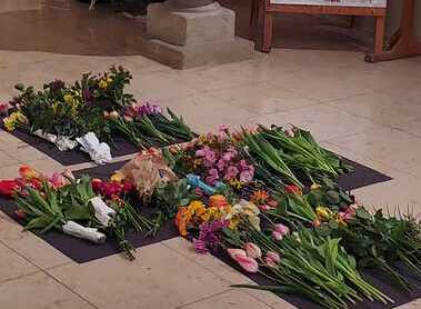 Am Karfreitag, einem der zwei strengsten Fasttage für Christen, wurde wieder an das Leiden und Sterben Jesu am Kreuz gedacht. Die von den Gläubigen mitgebrachten und am Kirchenboden in Kreuzform liebevoll angeordneten Blumen schmücken unsere Kirche zu Ostern.