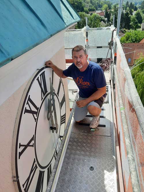 Im Zuge der Kirchensanierung und weil die Kirche eingerüstet war, waren der Spenglerfirma Schäden an den Uhrzeigern aufgefallen und sie montierten diese ab. Was sich zuerst als Schaden an lediglich drei Uhrzeigern darstellte, führte in der näheren Betrachtung dazu, dass das Wetter eigentlich allen Zeigern so zugesetzt hatte, dass sie durchrostet und nur aufwändigst reparierbar gewesen wären. Durch die rasche Zusage von Bgm. Adolf Viktorik, natürlich die Sanierung zu übernehmen – in Kreuzstetten erhält aus alter Abmachung die Gemeinde die Kirchturmuhren – wurden Angebote eingeholt und die Firma Grassmayr erhielt den Auftrag. Am Montag 16. August war es dann soweit. Unser bewährter Uhren- und Glockentechniker Her Voglmüller brachte die neuen Zeiger nach Kreuzstetten. Stv. Vorsitzende des Pfarrgemeinderates Maria Strobl und Karl Toifl, die beide bei der Sanierung neben mehreren anderen tatkräftig mithelfen, freuten sich, diese in Empfang zu nehmen und dann auch bei der Montage dabei sein zu können. Die Pfarre Niederkreuzstetten dankt der Marktgemeinde Kreuzstetten für die Unterstützung und freut sich, nun wieder eine tadellose Kirchenuhr zu haben. Wie oft ging in den letzten Wochen des Pfarrers Blick zur zeigerlosen Uhr …