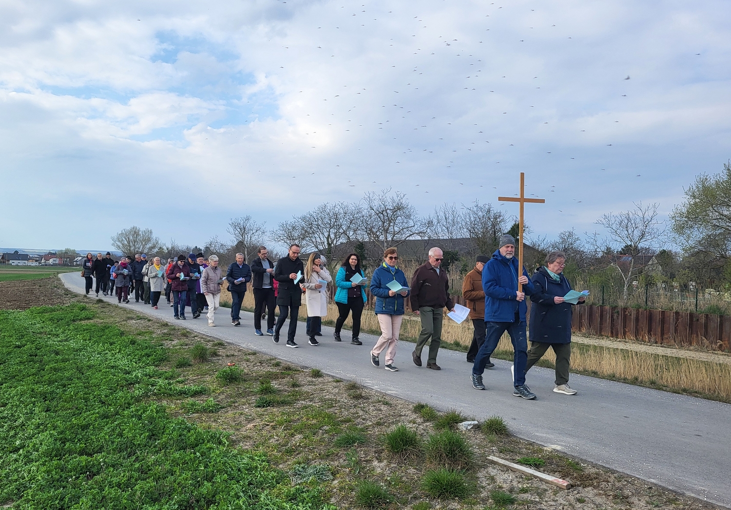 Den Kreuzweg gehen. Heute trafen sich die Pfarren des Pfarrverbandes in Pillichsdorf zum Kreuzweg im Freien. Gedanken rund um Symbole wie Stopschild, Pfeiferl oder Korb luden ein, inne zu halten und die Themen des Kreuzweges zu meditieren. Zum Abschluss lud die Pfarre Pillichsdorf zur Agape.