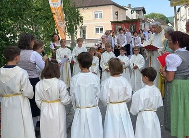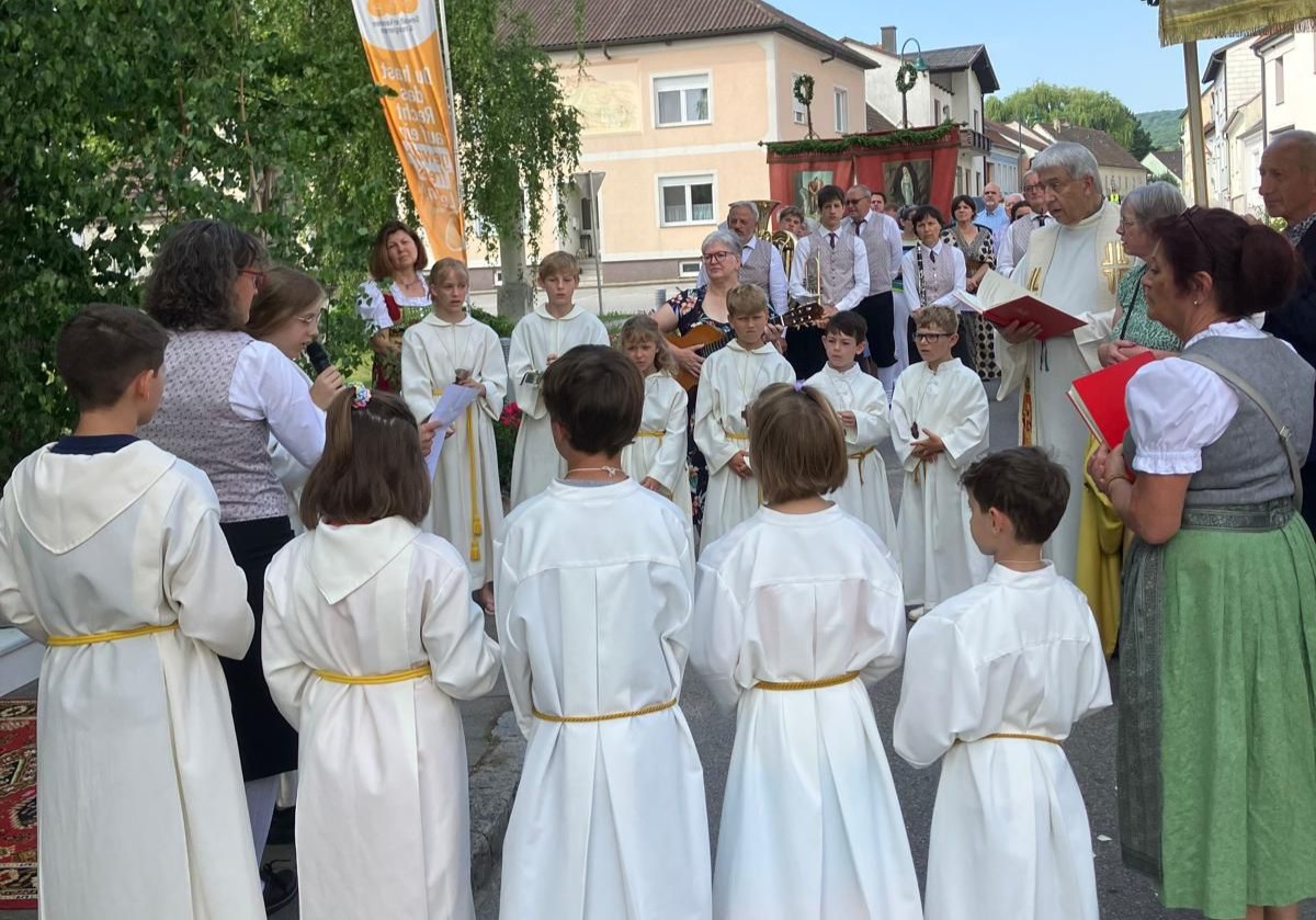 Nach dem feierlichen Hochamt in der festlich geschmückten Kirche fand die Prozession zu den vier Altären statt, begleitet von Kirchenchor, Musikverein und der Pfarrgemeinde. Die 2. Station am Marktplatz wurde von der Jungschar gestaltet. Unter der Leitung von Gabriele Stecher und Birgit Luckner lasen die MinistrantInnen und Erstkommunionkinder liebevoll vorbereitete Texte und sangen auch ein Lied.