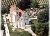 Die Pfarrkirche steht über dem Ort am Abhang des Schlossberges. Über ihr thront die Ruine der ehemaligen Burg.