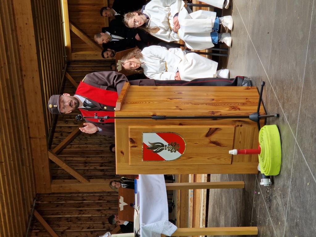 Die Statue des Hl. Florian wurde vom Leiter des Verwaltungsdienstes Bernhard Ziegler zum Altar getragen. Diese Statue steht ansonsten in der Glasvitrine beim Eingang (Poysbrunnerstraße) zum Feuerwehrhaus
