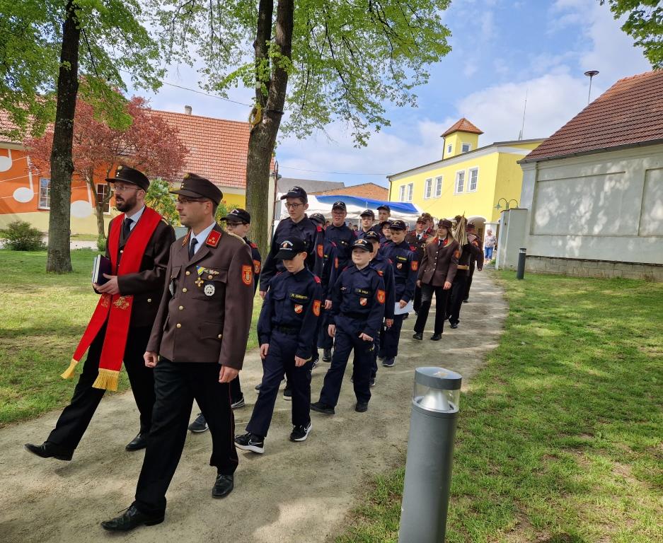 Einzug zur Hl. Messe mit Pfarrer Richard Hansl und Feuerwehrkommandant Ronald Habermann an der Spitze