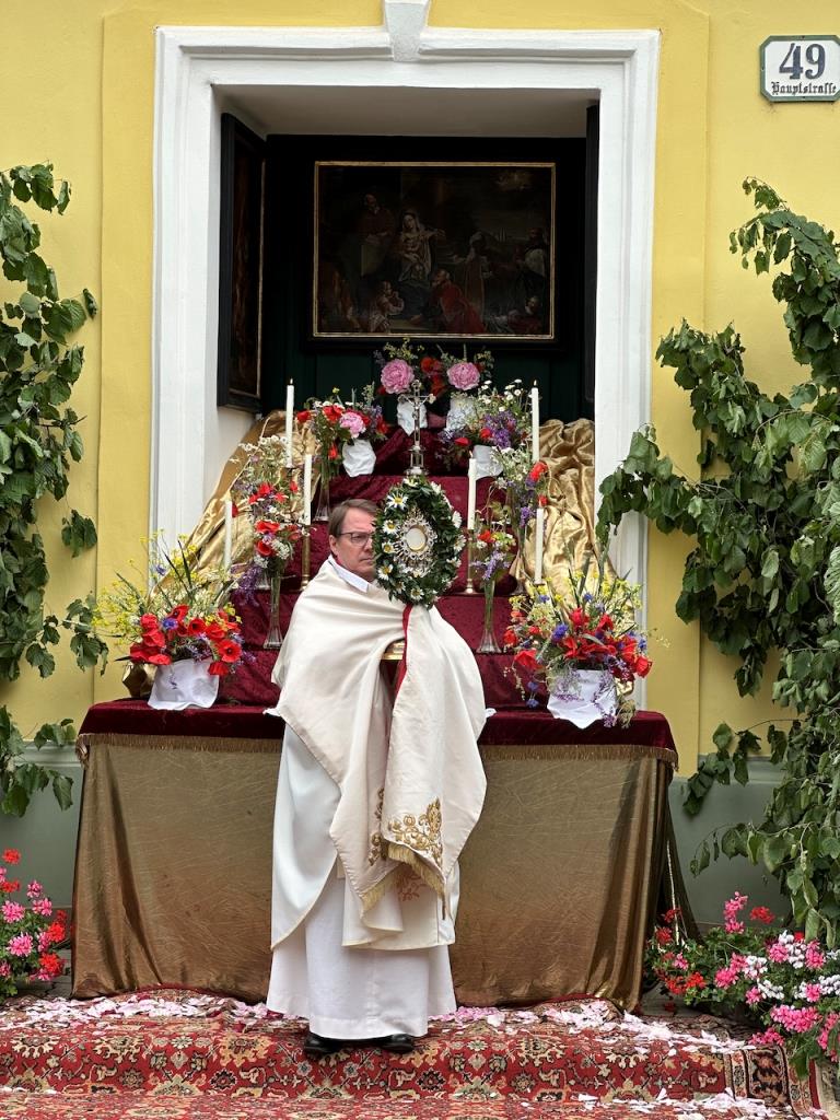 Als sichtbares Zeichen für die wirkliche Gegenwart Christi trugen wir das eucharistische Brot, die Hostie, in der Monstranz in einer feierlichen Prozession durch unseren Ort.