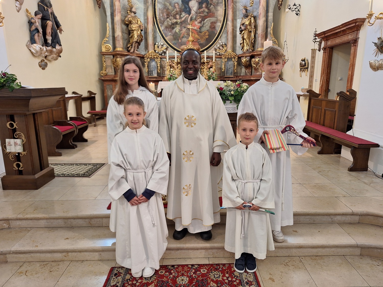Am Sonntag nahmen wir Abschied von unserem Ministranten Tobi, der nach vielen Jahren treuen Dienstes als Ministrant seinen Platz am Altar weitergibt. Gleichzeitig freuen wir uns sehr, Raphael heute offiziell in unsere Ministrantengemeinschaft aufzunehmen. Wir wünschen ihm viel Freude für deinen Dienst am Altar.