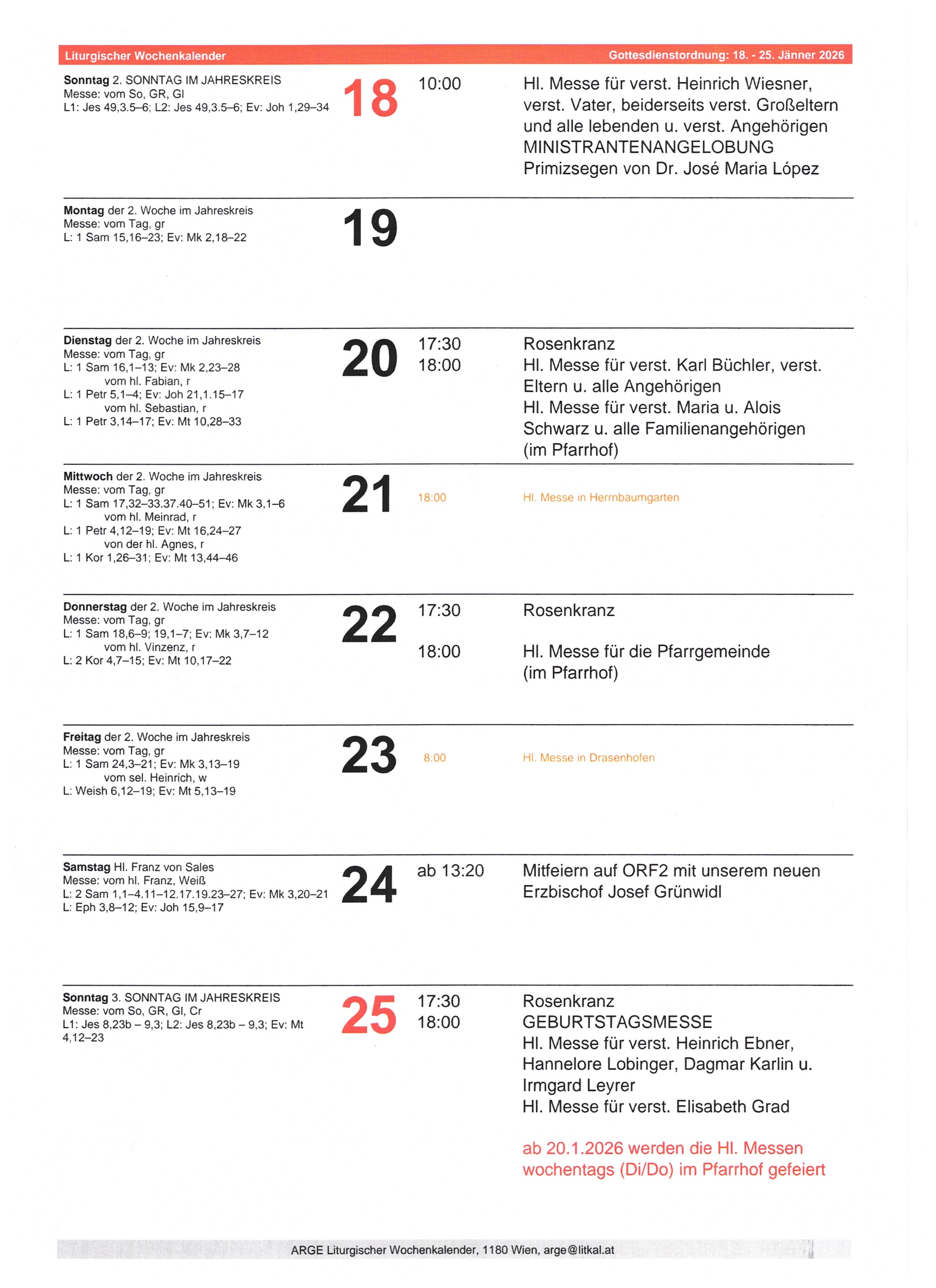 Einladung zur Hl. Messe am 18.1.2026
