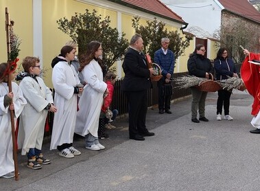 Zu Beginn der Feier des Einzugs Christi in Jerusalem wurden die Palmbuschen gesegnet. Anschließend zog Pfarrer Richard mit allen Anwesenden in einer Prozession in die Kirche und verteilte den Messbesuchern die Palmzweige. Danach wurde der Palmsonntag mit einem Gottesdienst gefeiert.