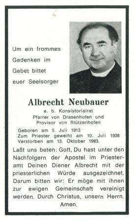 Pfarrer Withofner stirbt am 12. September überraschend. Er hatte zuvor am Vormittag noch das Burschenamt gehalten. Das Begräbnis findet am 15. September statt. KR Leopold Withofner wirkte über 40 Jahre in Stützenhofen. Am 13. September übernimmt Pfarrer Albrecht Neubauer als Provisor die Pfarre von Stützenhofen.