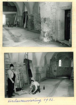 Die Pfarrgemeinde steht vor dem Problem, dass die Chorempore instabil ist. Messner Gerhard Wolfram hat die lösende Idee. Der Boden der Empore wird mit zwei Stangen auf den Hauptbalken des Dachstuhls gehängt. Diese Lösung in unauffällig. Auch die Fassade des Pfarrkellers hat er renoviert.
