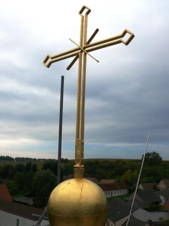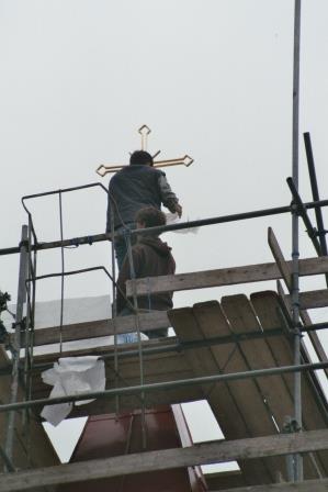 Räuberleiter am Kirchturm! Die Kreuzkugel und das Kreuz wurden neu vergoldet und werden wieder am Turm aufgesetzt. In die Kugel wird eine Kupferrolle eingelegt. In dieser Kupferrolle befinden sich die alten Kreuzkugelinhalte und auch ein aktueller Bericht über die Ortschaft und die Kirchenrenovierung.