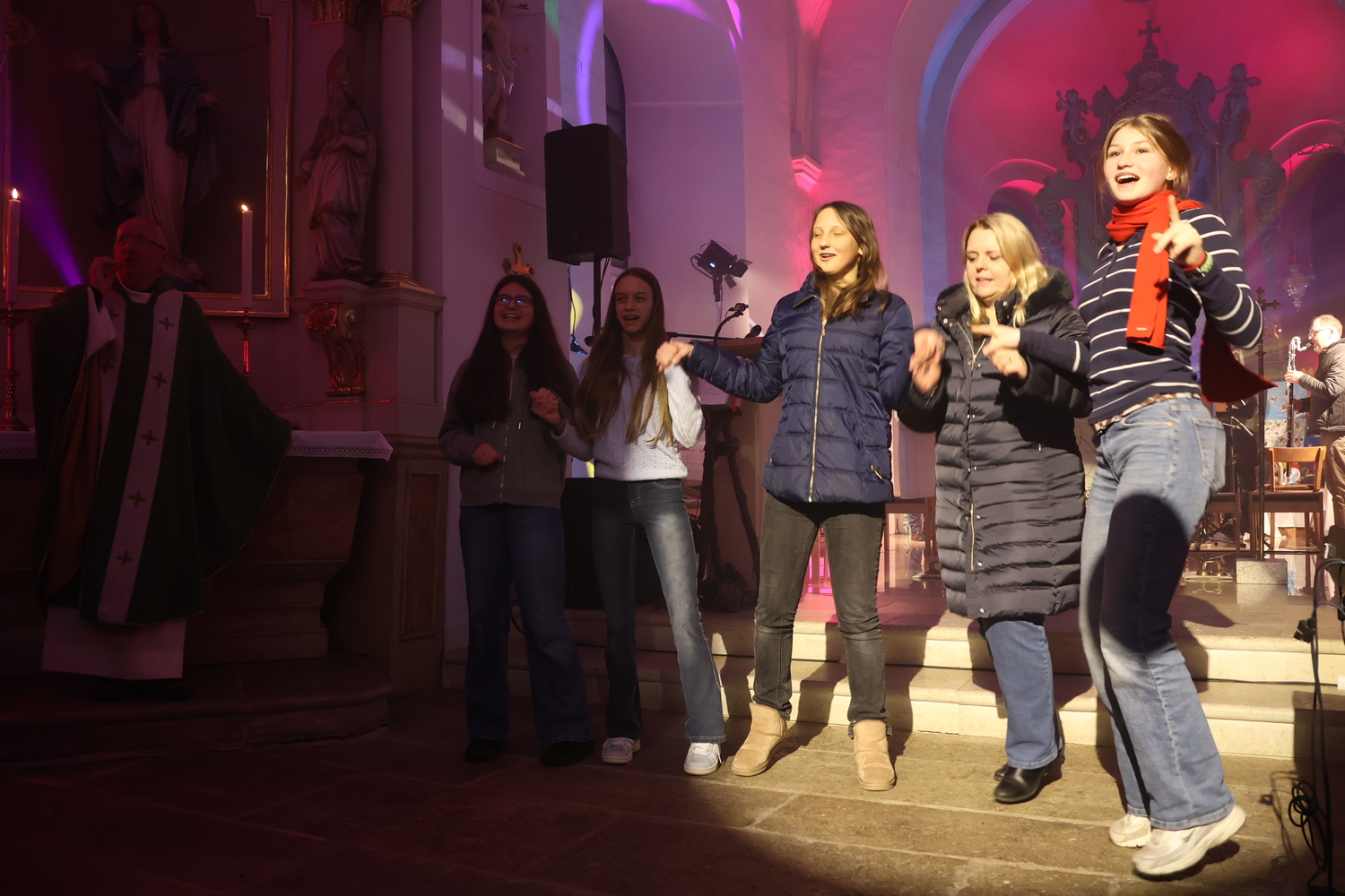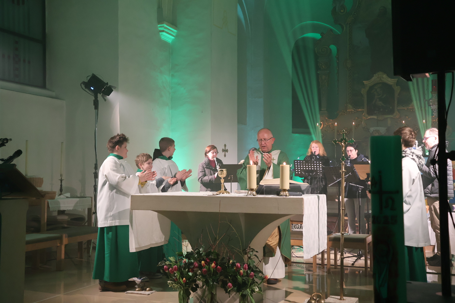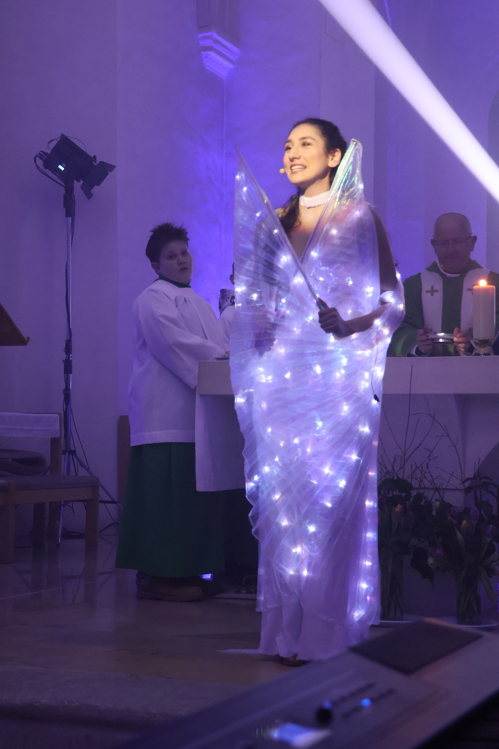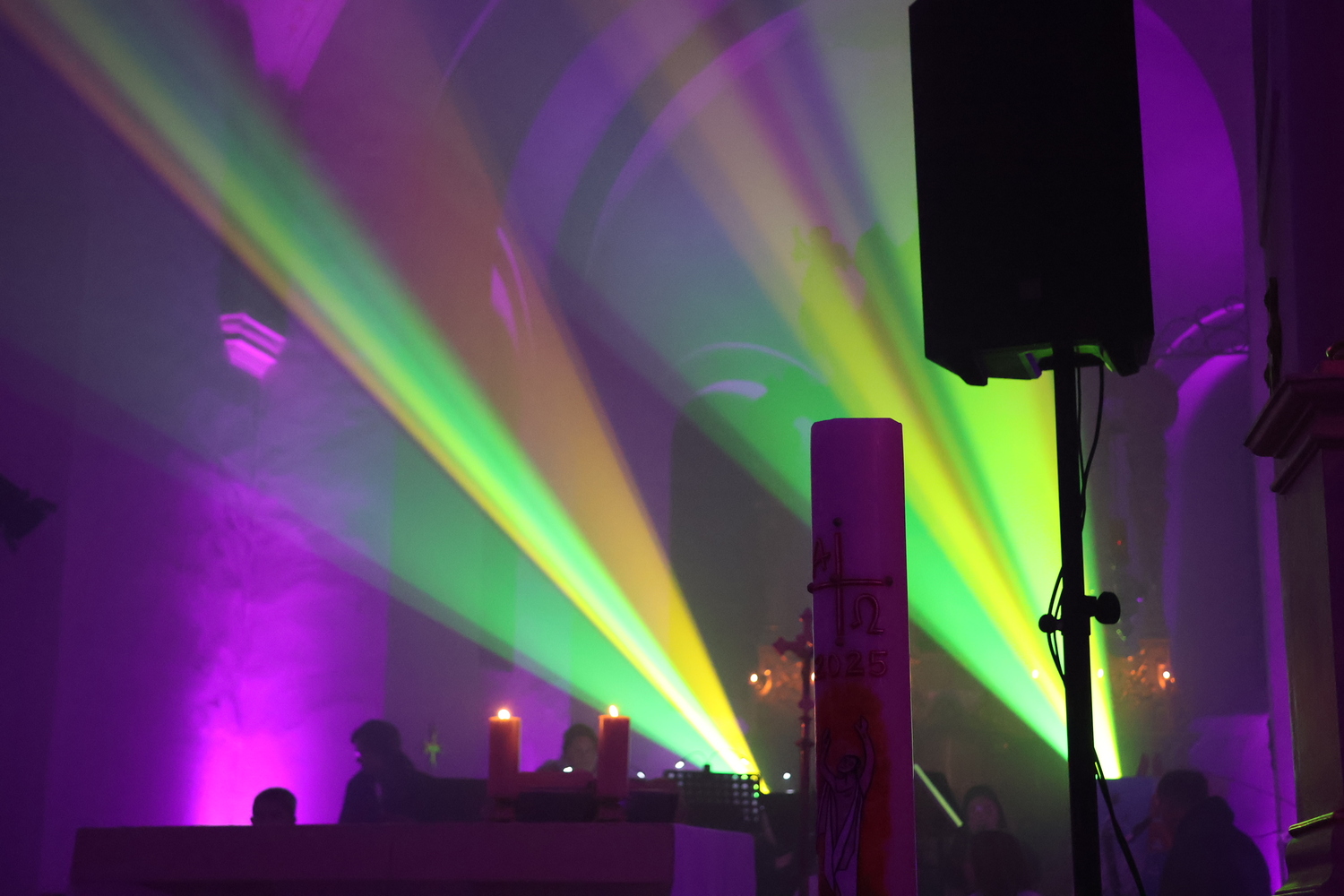 Die Kirche erstrahlte in beeindruckenden Lichteffekten, die eine außergewöhnliche Atmosphäre schufen und den Kirchenraum in ein neues Licht tauchten. Musikalisch wurde der Gottesdienst auf besondere Weise gestaltet: Bekannte Lieder der Kultband ABBA gaben der Feier einen modernen, lebendigen Rahmen und luden zum Zuhören, Mitschwingen und Mitfühlen ein.
