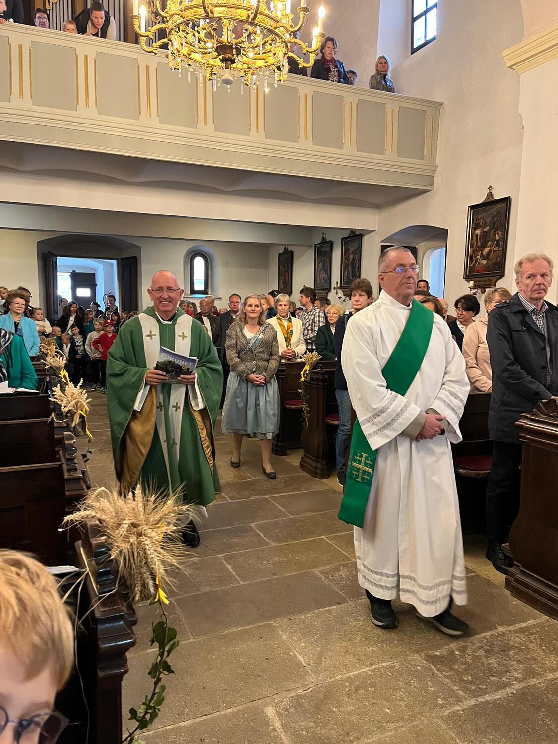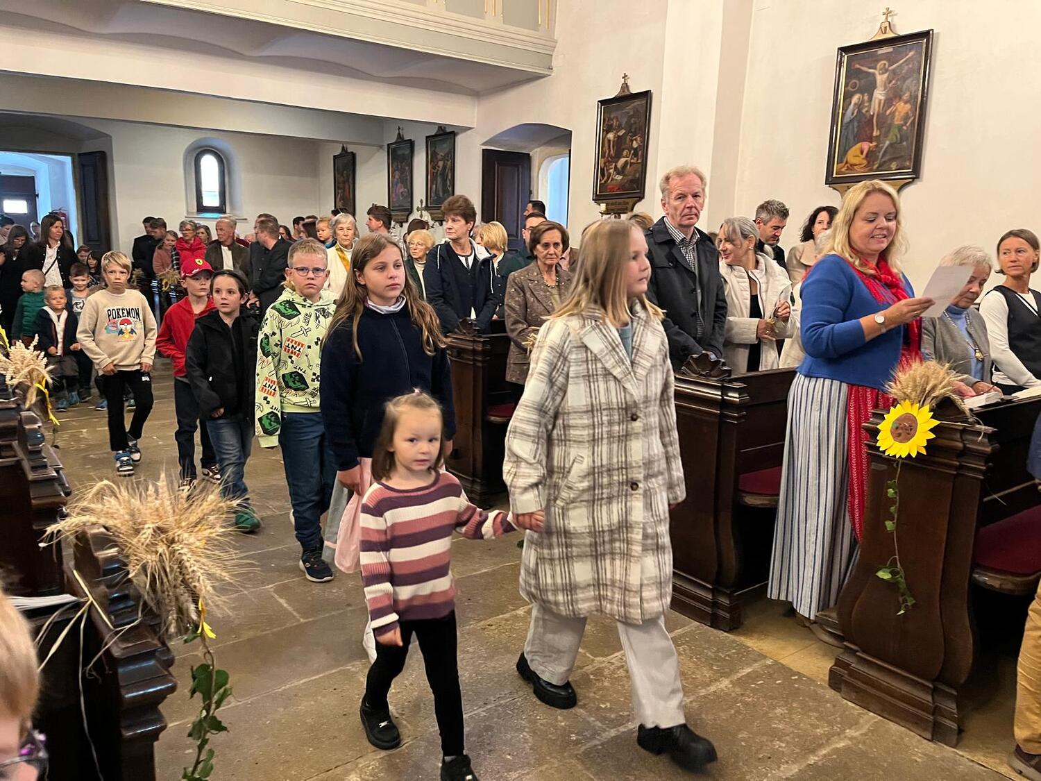 Den Auftakt bildete der feierliche Festgottesdienst, bei dem die wunderschön gestaltete Erntekrone gesegnet wurde. Parallel dazu feierten die Kinder in den Jugendräumen ihren eigenen Kinderwortgottesdienst zum Erntedank und zogen zum feierlichen Vaterunser gemeinsam in die Kirche ein. Anschließend bewegte sich die Gemeinde in einem farbenfrohen Umzug mit alten Traktoren durch den Ort.