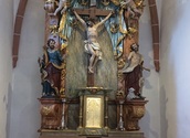 Hochaltar um 1760, marmoriert, leicht einschwingendes Retabel mit Gebälkabschluss auf Volutenkonsolen und Kruzifix unter Baldachin.