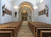 Langhaus, dreijochiger Saalraum mit Kreuzgratgewölbe von 1704 auf mächtigen Pilastervorlagen,