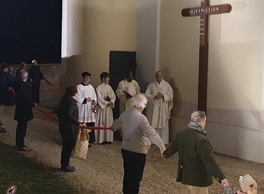 Nach dem feierlichen Festgottesdienst mit Pater Karl Wallner wurde die Kirche von der versammelten Gemeinde mit bunten Bändern umarmt und die Fassade gesegnet. Ein besonderer Blickfang war die färbige Bestrahlung der Kirche, die weithin sichtbar die Bedeutung dieses Tages zum Ausdruck brachte.