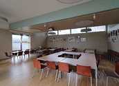 Es gibt einen großen barrierefreien Eingangsbereich, eine Garderobe, Toiletten sowie eine Küche mit Kochfeld und Backrohr, Industriegeschirrspüler. Teller, Gläser etc.