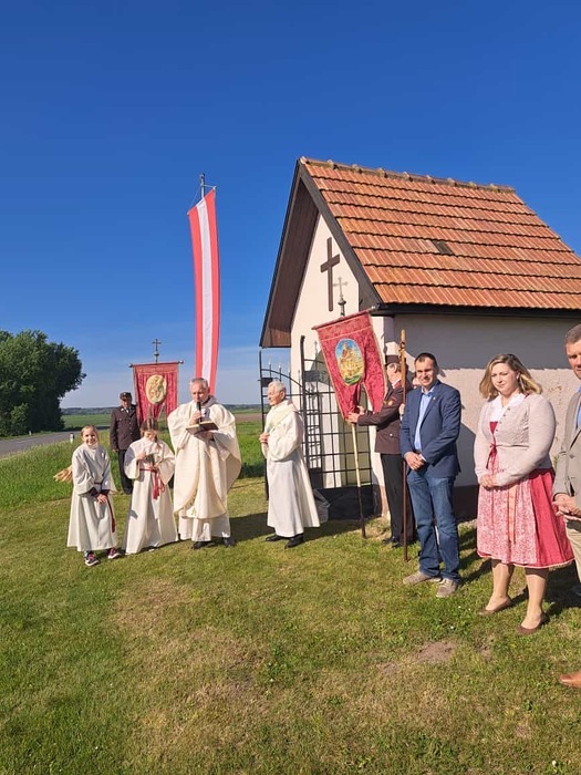 Die Florianifeier in Wagram beginnt mit der Prozession zur Florianikapelle, wo nach Gebet und Segen auf dem Rückweg das Florianilied gesungen wird.
