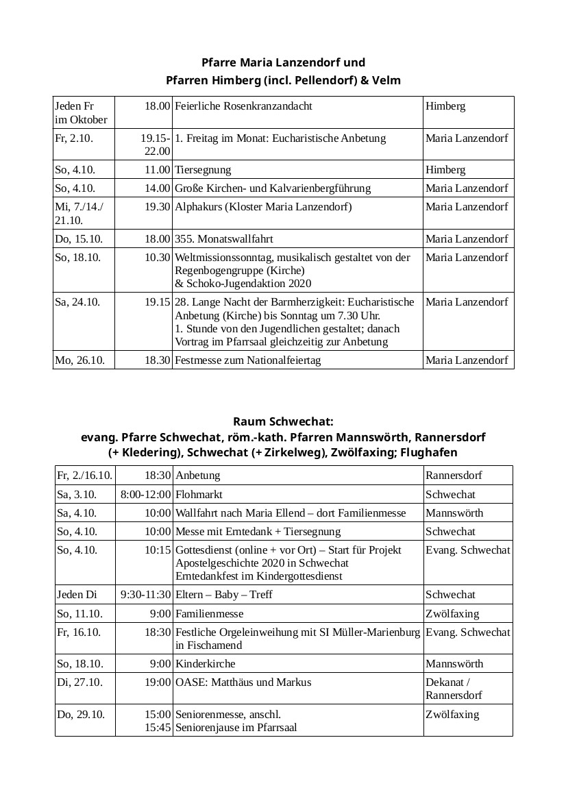 Auf der Homepage des Dekanates findet man viele Informationen, v. a. auch Links zu den einzelnen Pfarren / Pfarrverbänden / Seelsorgeräumen, wo die Termine stets aktualisiert werden: