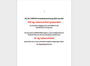 Die LEO- Sammlung der Caritas zum Erntedank erbrachte ein beachtliches Ergebnis: 575 kg Lebensmittel wurden von den Ebenthalerinnen und Ebenthalern am 27. und 28. September gespendet