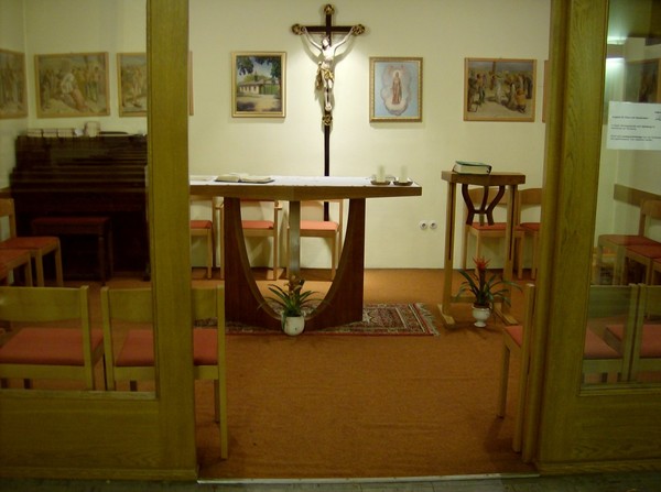 In der Wochentagskapelle lassen sich die heiligen Messen auch bei geschlossener Türe über Lautsprecheranlage mitfeiern. Dabei können Kinder und Eltern alles hören, werden aber selbst nicht gehört.
