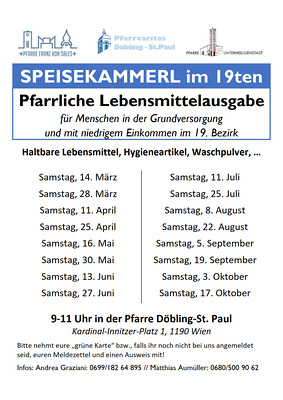 Gemeinsam mit der Pfarre Franz von Sales und der Pfarre Unterheiligenstadt versuchen wir im Rahmen unserer Lebensmittelausgabe notleidenden Menschen aus dem 19. Bezirk zu helfen. Spenden in Form von haltbaren Lebensmitteln, Waschpulver, Hygieneartikeln, kullinarische Besonderheiten... oder Supermarktgutscheine (jeweils 10 €) werden dringend benötigt!