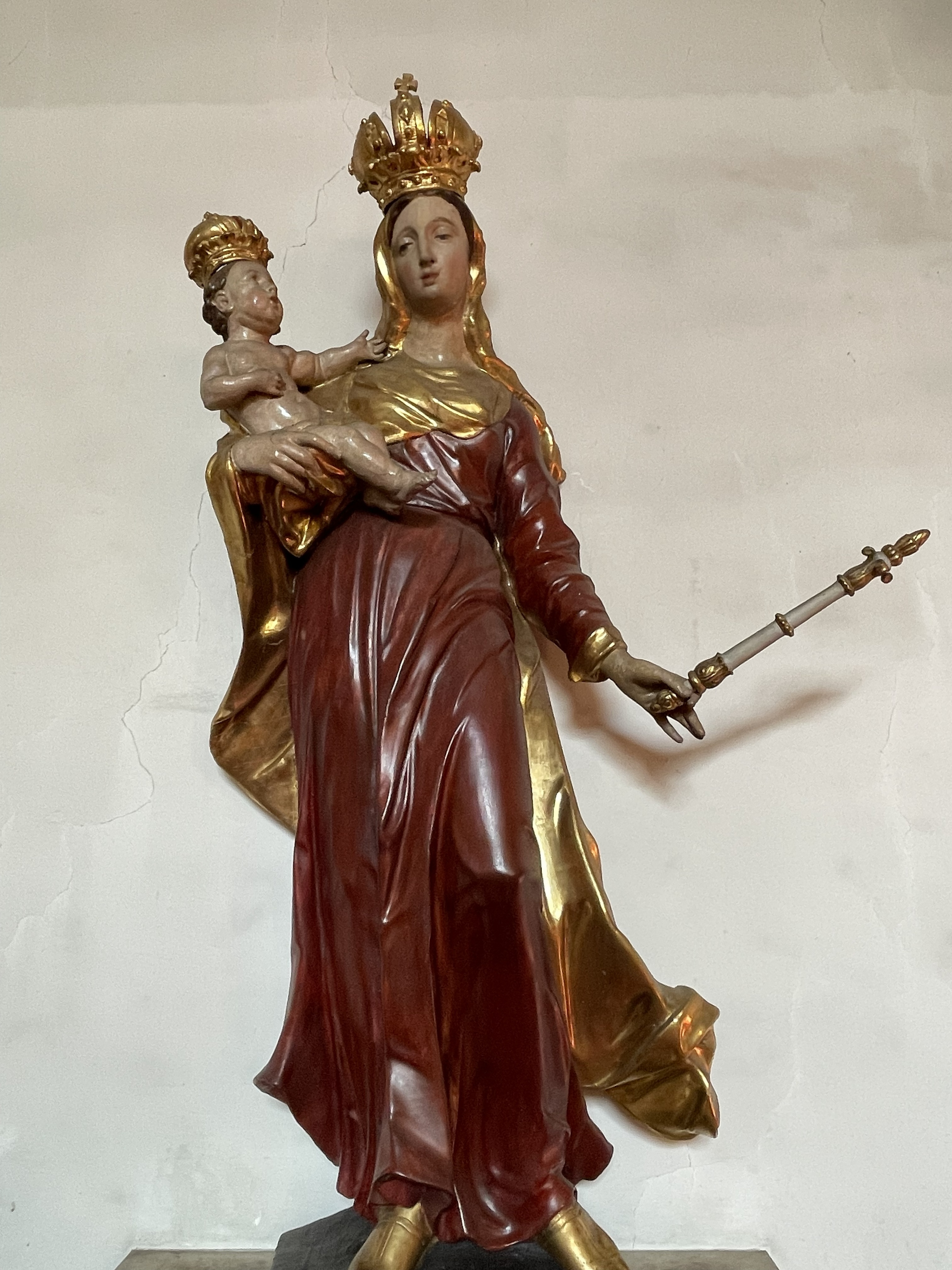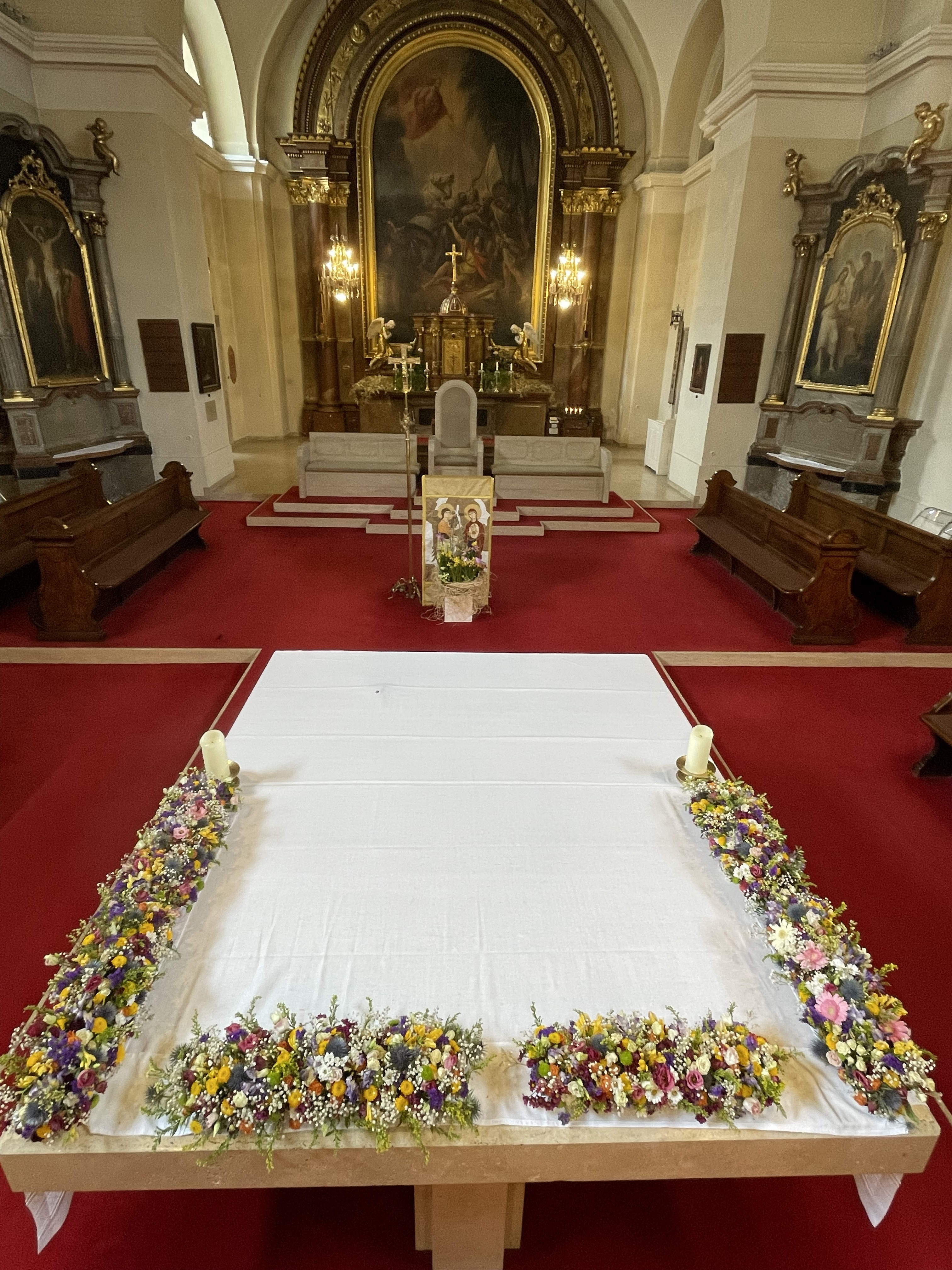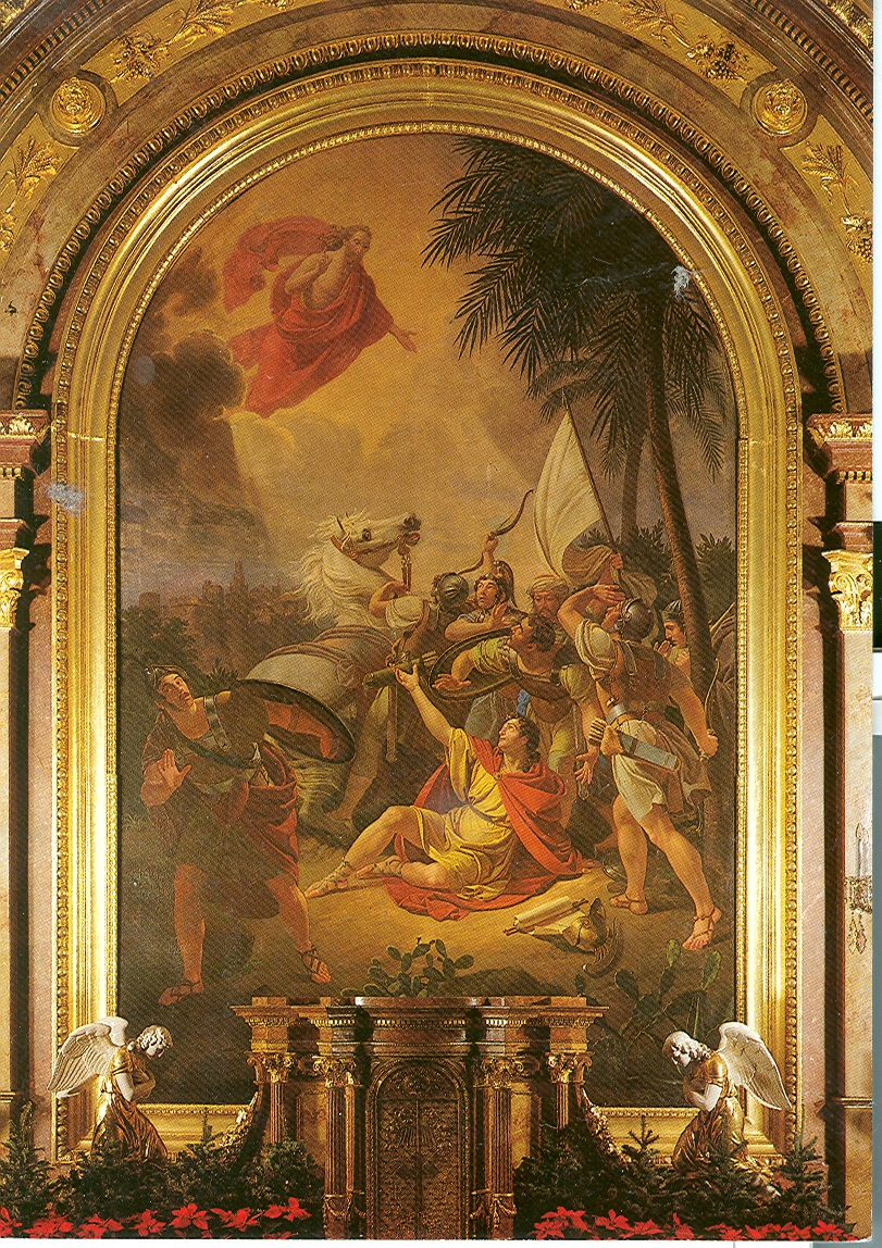 Das prächtige Gemälde stammt von dem Wiener Maler Josef Schönmann (1798–1879) und wurde im Jahre 1829, dem Jahr der Kirchenweihe, gemalt. Schönmann studierte Historienmalerei an der Wiener Kunstakademie unter dem damaligen Direktor Josef Füger, einem der Hauptvertreter des „Barock-Klassizismus“ des ausgehenden 18. Jahrhunderts, ein Stil, in dem alles „Heroische“, „Klassische“, „Pathetische“ zum Ausdruck kommen sollte. Besonders beliebt waren bewegte, bedeutende historische Szenen in leuchtenden und dunklen Farbtönen, edle, durchgeistigte Gesichter, pathetische Gesten, genaue historische Kostüme in antikisierenden Faltenwürfen.