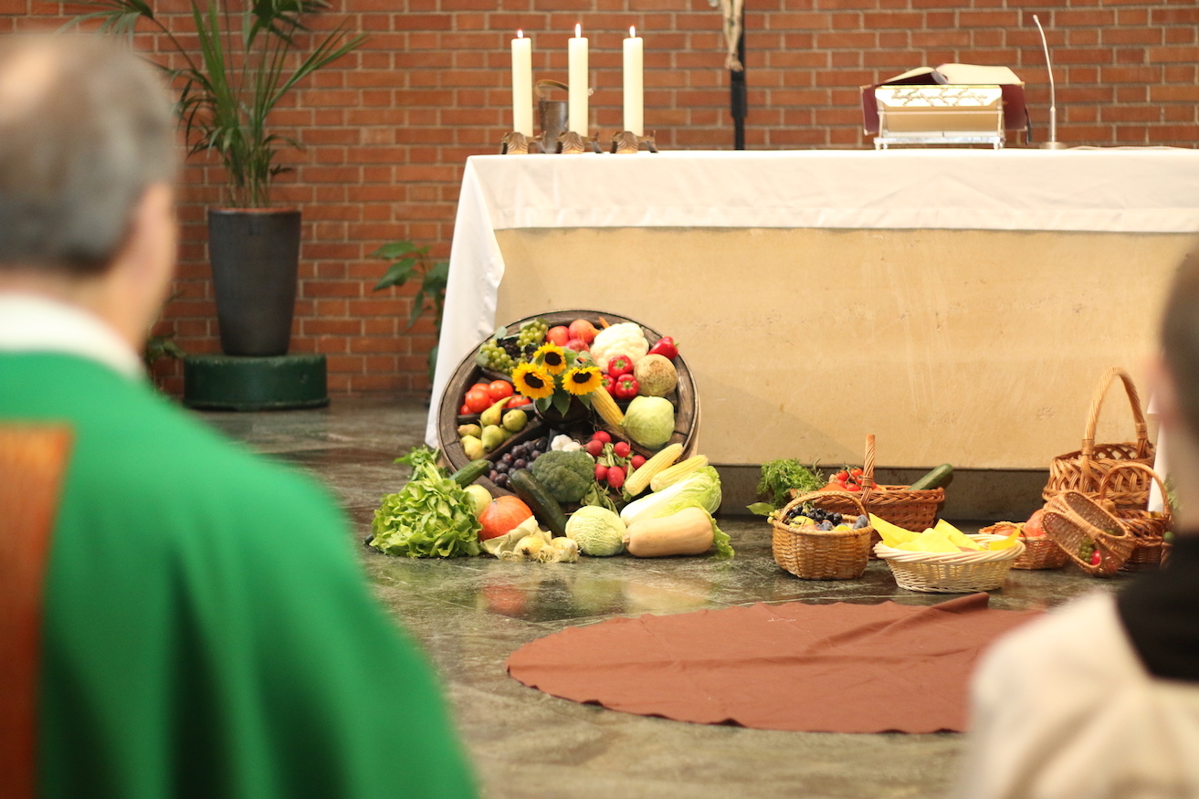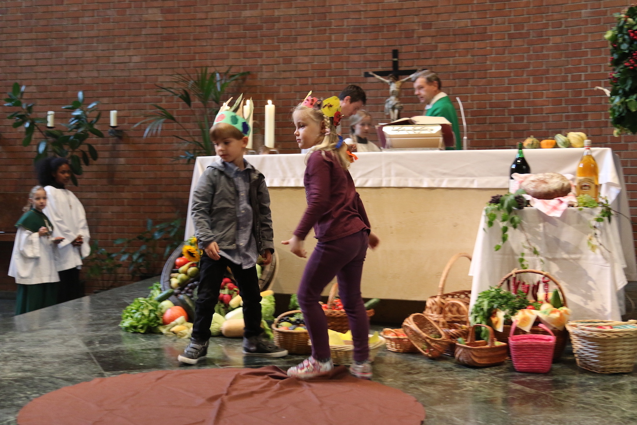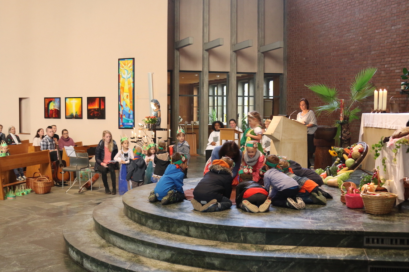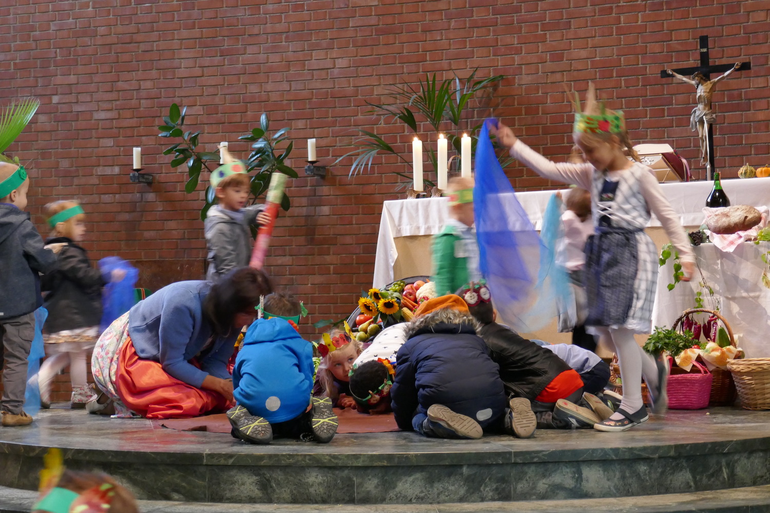 In einem kurzen Schauspiel führten uns die Kinder lebendig vor Augen, dass alles, was wir zum Leben brauchen, ein Geschenk Gottes ist: Nur mit seiner Hilfe kann aus vielen kleinen Samenkörnern schlussendlich Brot werden, das uns satt macht.