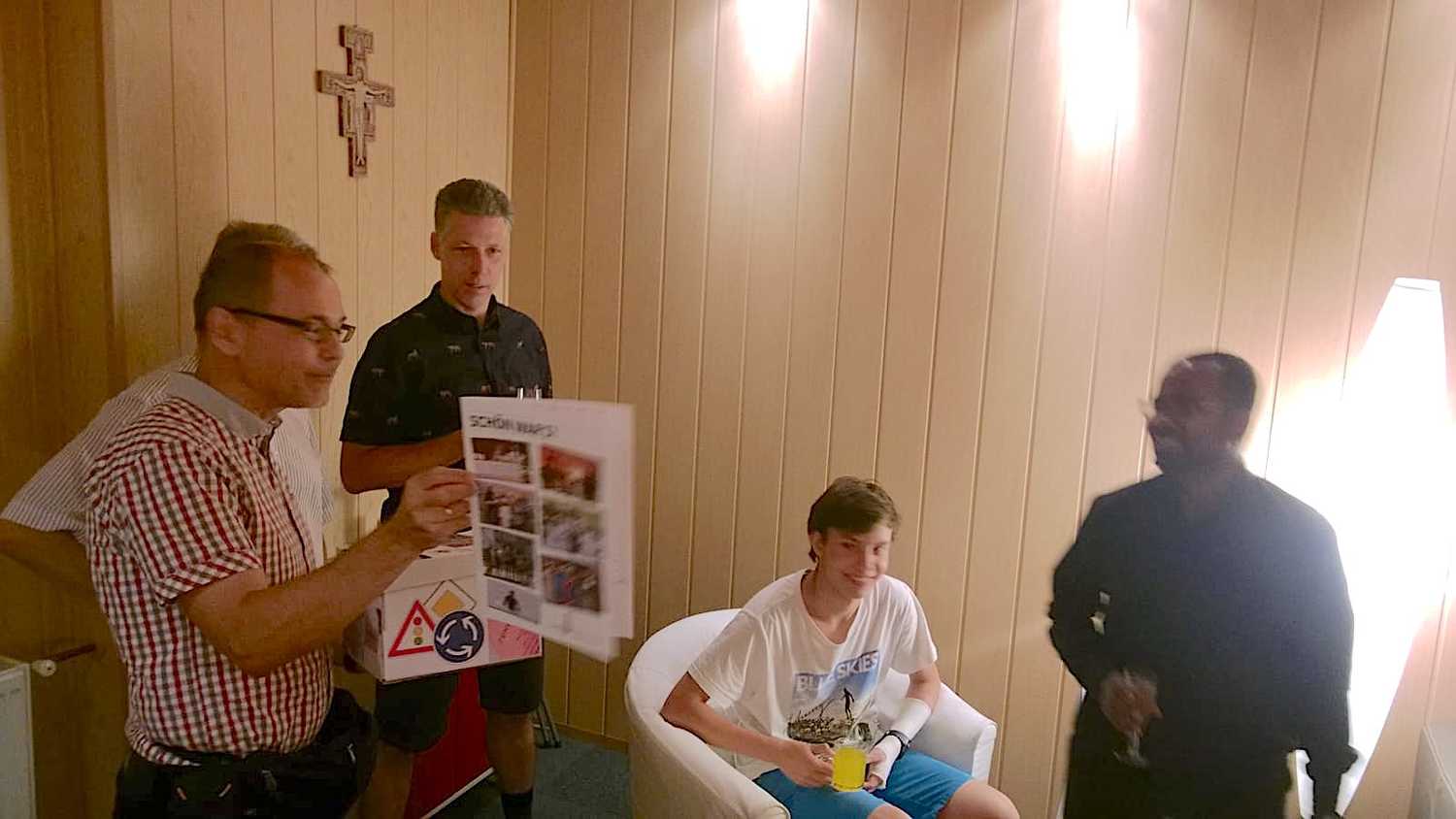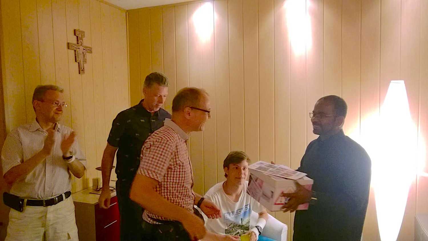 Nach einem Besuch beim Eissalon ging es zurück ins Pfarrheim, wo P. Sagai ein Abschiedsbillet und eine Geschenkebox mit Spenden für den Führerschein überreicht bekam. Da sein indischer Führerschein in Europa nicht anerkannt wird, muss er in seiner neuen Heimat bei Regensburg schon bald zurück in die Fahrschule. Vielleicht führt ihn ja eine der ersten Ausfahrten auf Besuch nach Wien? Wir würden uns auf jeden Fall freuen!