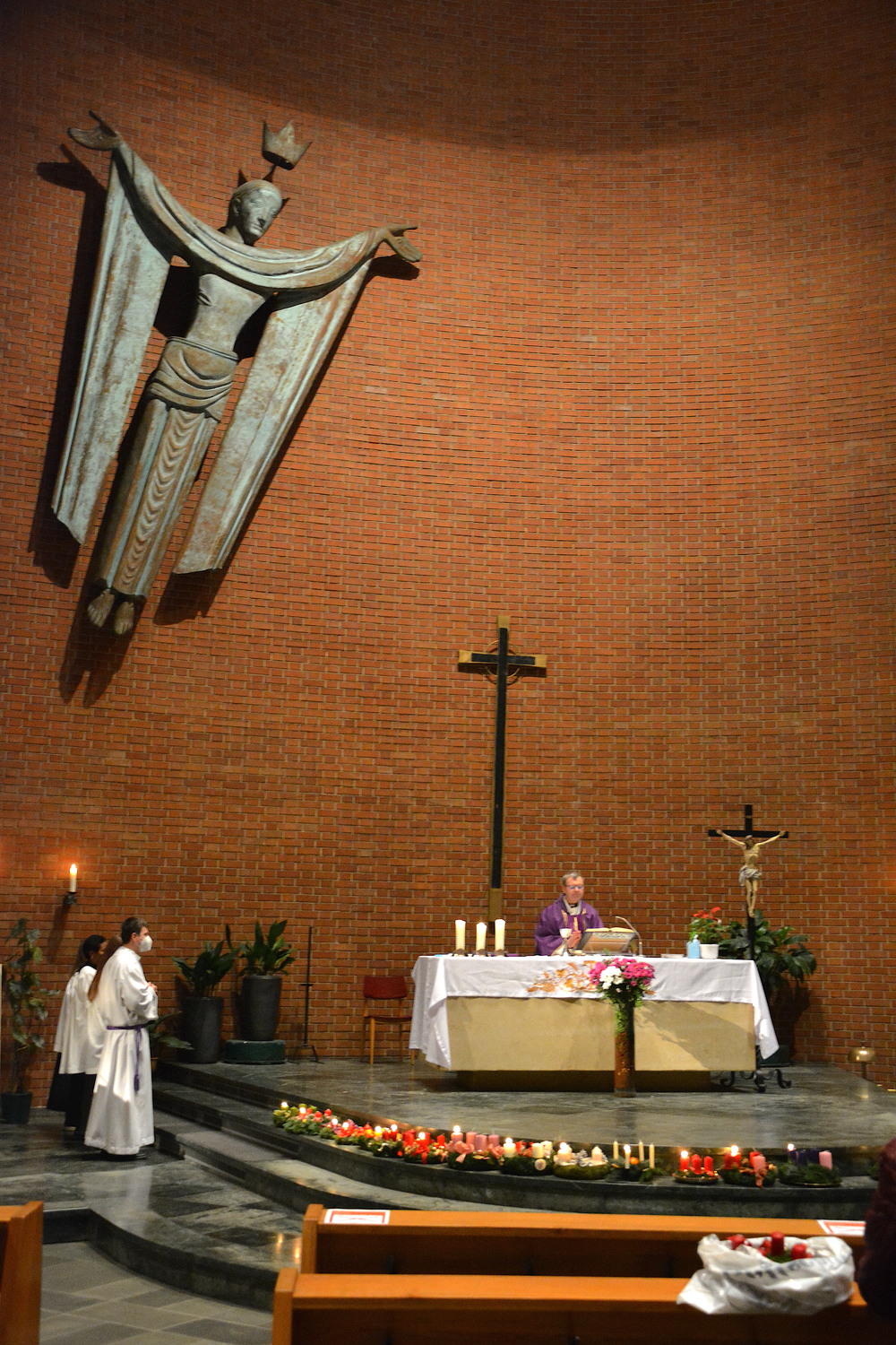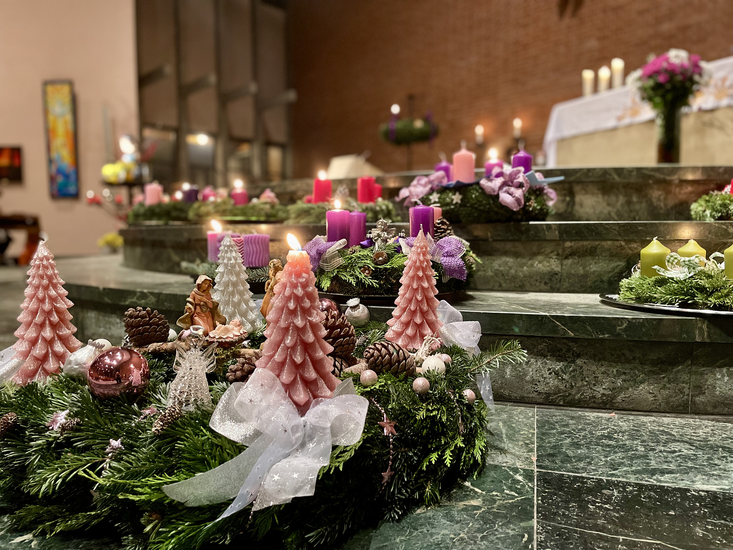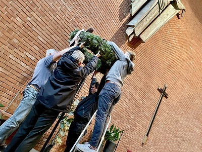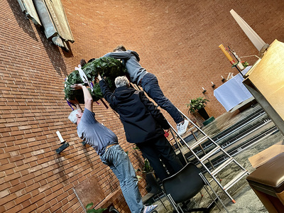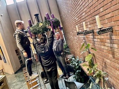 Trotz Lockdowns war es heuer wieder möglich, die Adventkranzsegnung im Rahmen eines Gottesdiensts durchzuführen. Zur Befestigung des Adventkranzes im Altarraum brauchte es zuvor einige starke Männer.