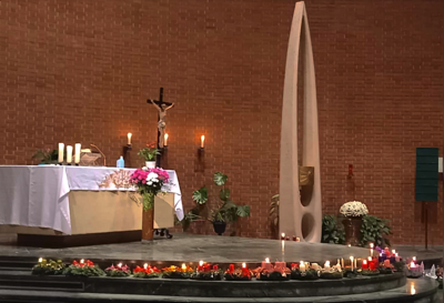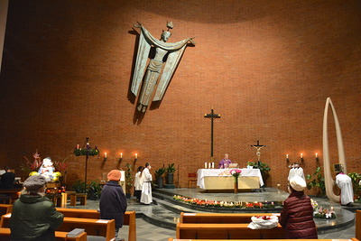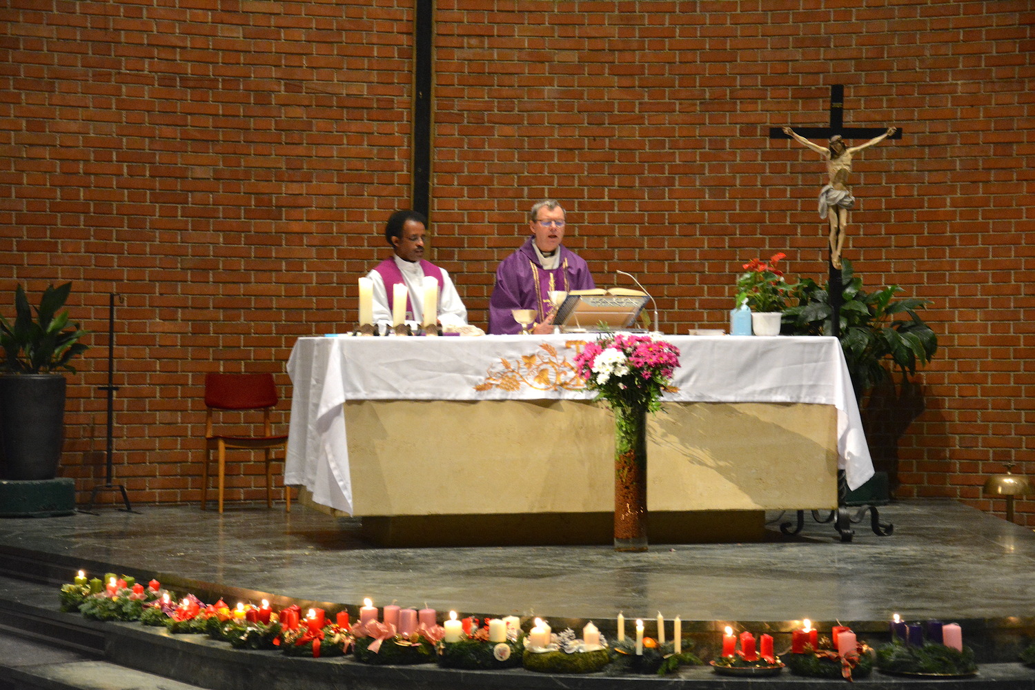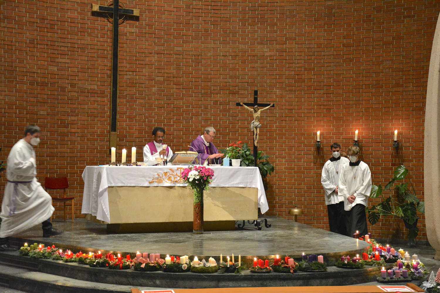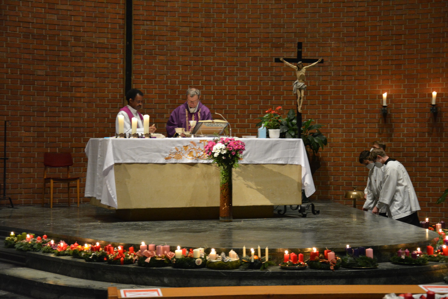 Trotz Lockdowns war es heuer wieder möglich, die Adventkranzsegnung im Rahmen eines Gottesdiensts durchzuführen. Zur Befestigung des Adventkranzes im Altarraum brauchte es zuvor einige starke Männer.