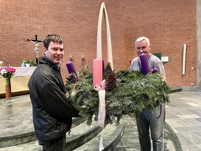 Trotz Lockdowns war es heuer wieder möglich, die Adventkranzsegnung im Rahmen eines Gottesdiensts durchzuführen. Zur Befestigung des Adventkranzes im Altarraum brauchte es zuvor einige starke Männer.
