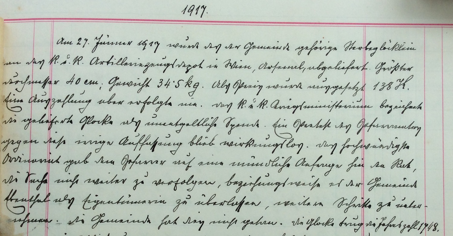 "Der 9. Juni 1917 (Samstag) war ein Festtag für Ebenthal. Der jugendliche Kaiser Karl von Oesterreich erschien mit kleinem Gefolge, um dem hier weilenden König Ferdinand von Bulgarien seinen Besuch abzustatten. Ein feierlicher Empfang vonseite der Gemeinde fand nicht statt, da die bevorstehende Ankunft des Kaisers nur wenige Stunden vor dessen Eintreffen bekanntgemacht wurde. Der Pfarrer, die Gemeindevorstehung mit Bürgermeister Josef Veit, die Schuljugend mit dem Lehrkörper und eine beträchtliche Volksmenge erwarteten auf dem Platze vor dem Schlosse Seine Majestät. ...."