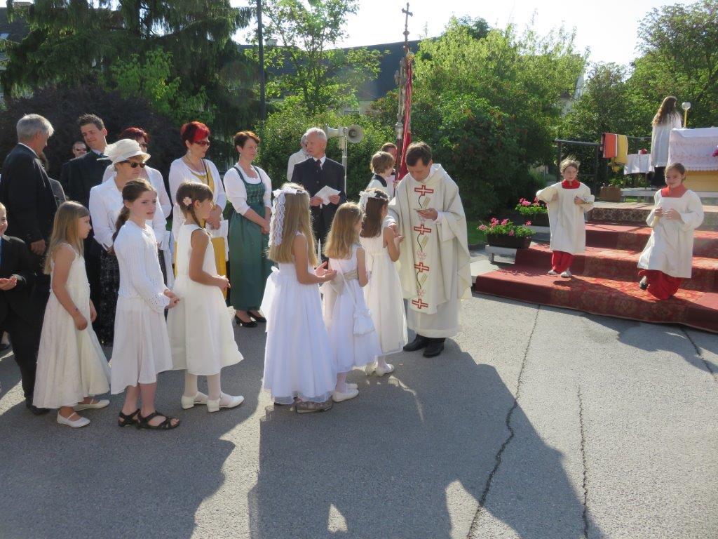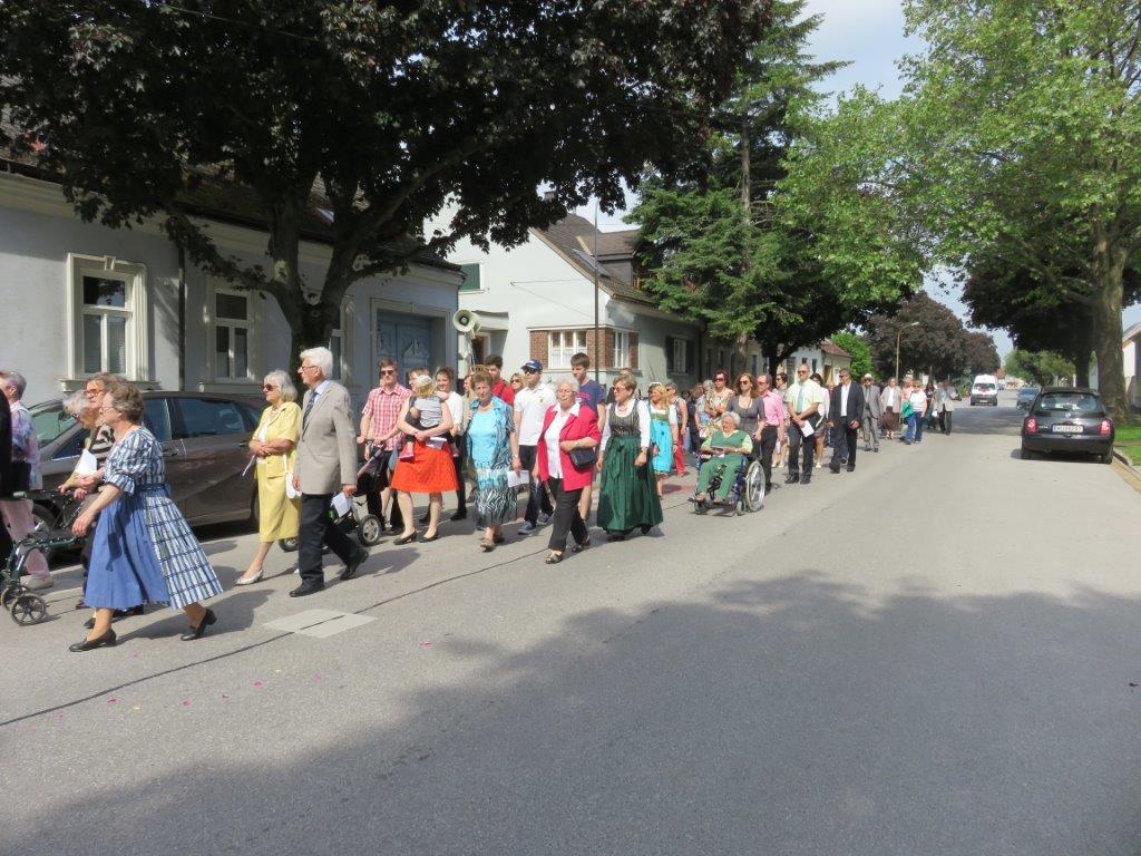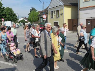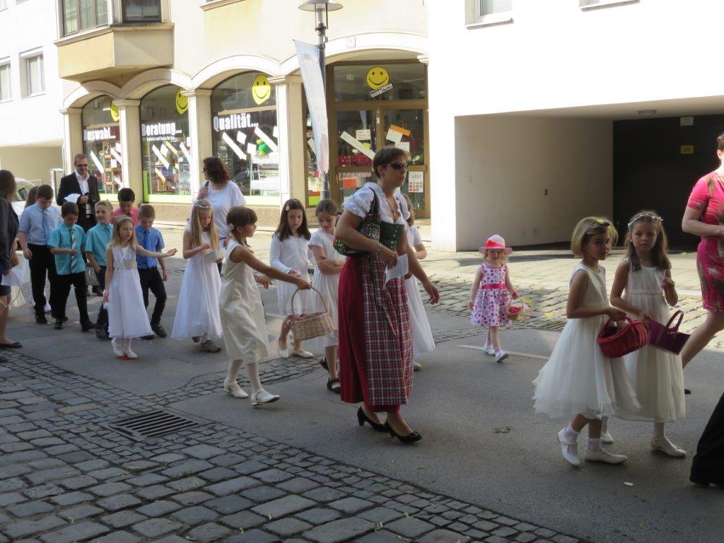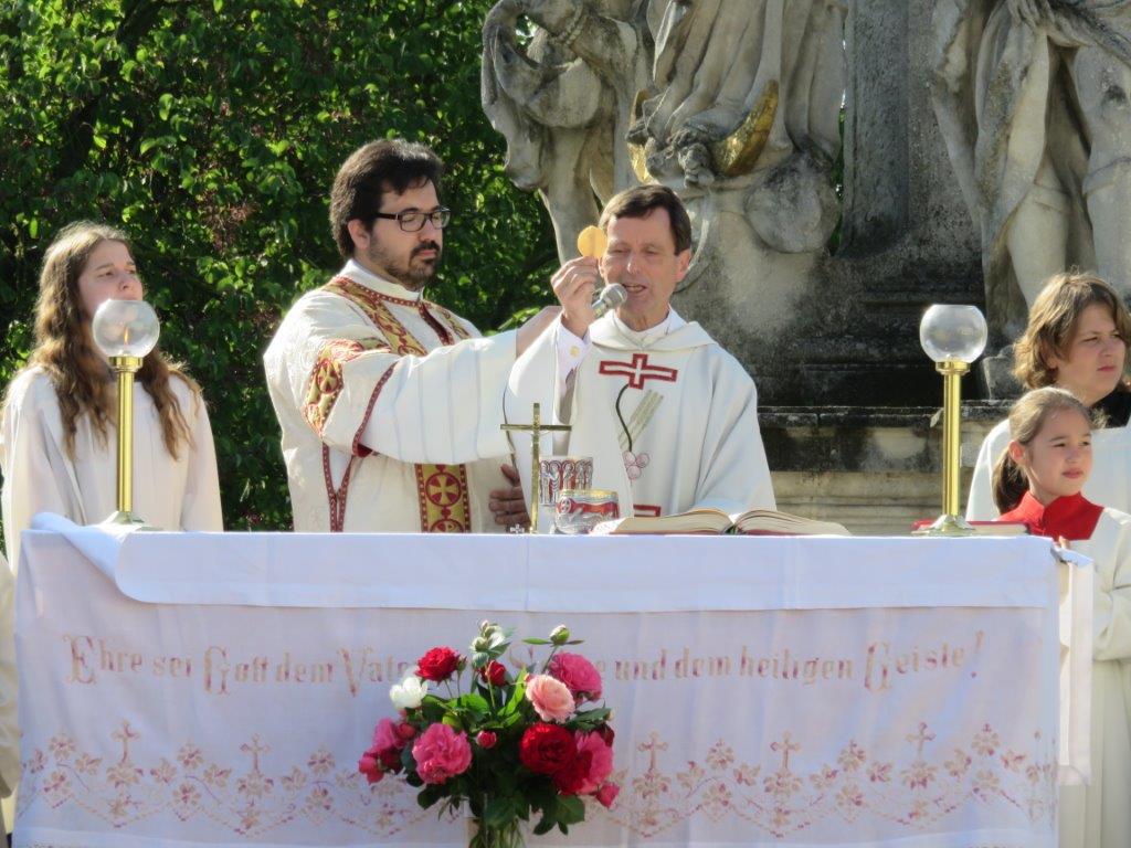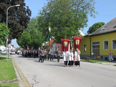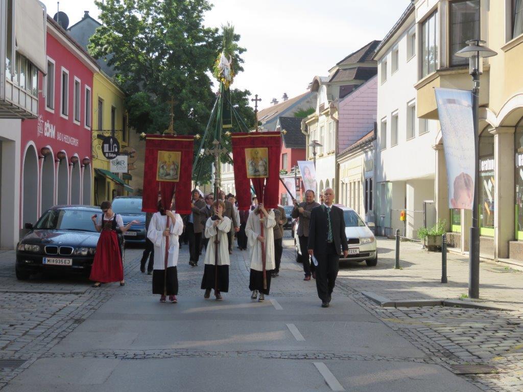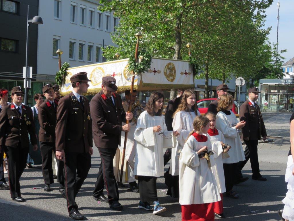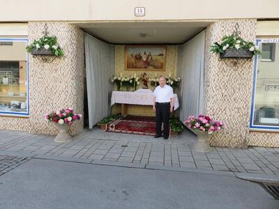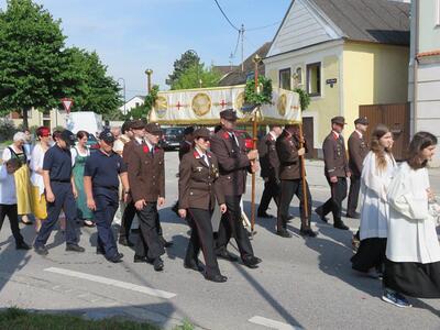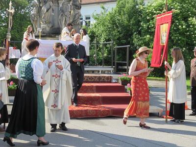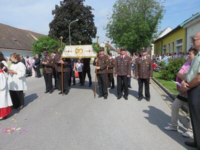 Am Sonntag, 29. Mai begangen wir das Fronleichnamsfest. Was wir an Fronleichnam feiern, ist die Freude darüber, dass Jesus wirklich unter uns gegenwärtig ist. Dazu schmückten wir die Fenster der Häuser am Wege der Prozession, daher zogen wir mit Musik, Gesang, mit Fahnen und festlicher Kleidung durch unsere Straßen. Deshalb nennen wir dieses Brot das „Allerheiligste“. Der Priester trug es in einer prächtigen Monstranz, unter dem „Himmel“, segnet damit unsere Gemeinde und alle Menschen, besonders die Kranken, Bedrängten und Notleidenden.