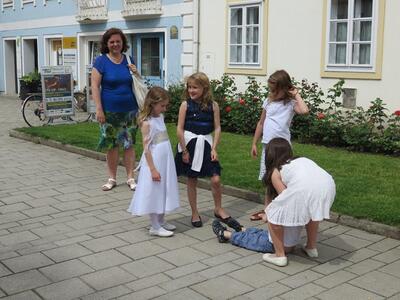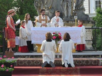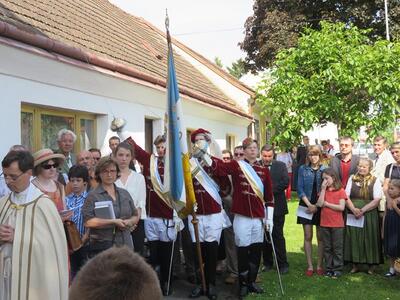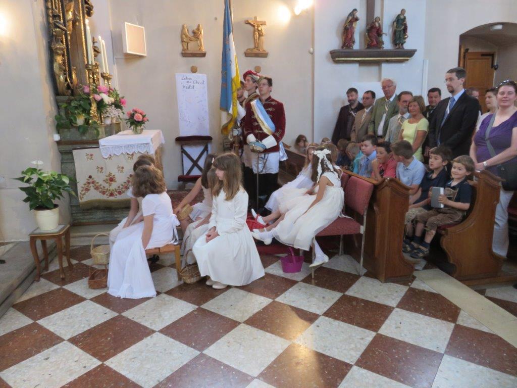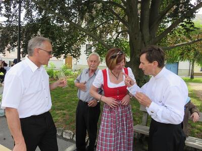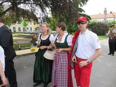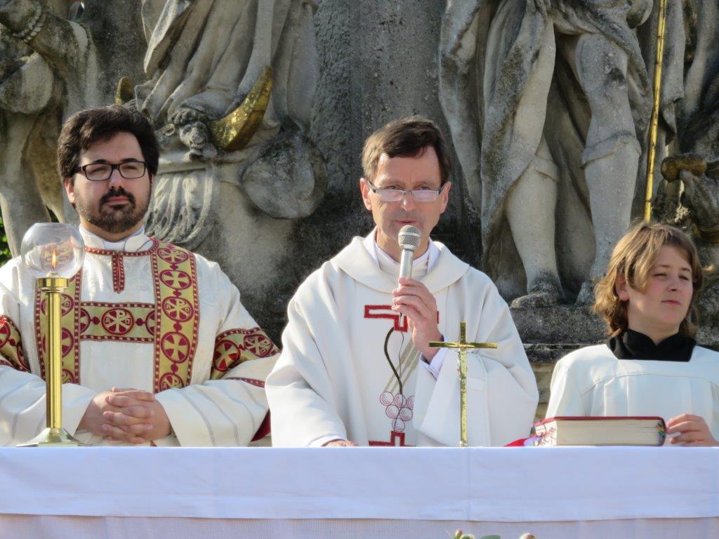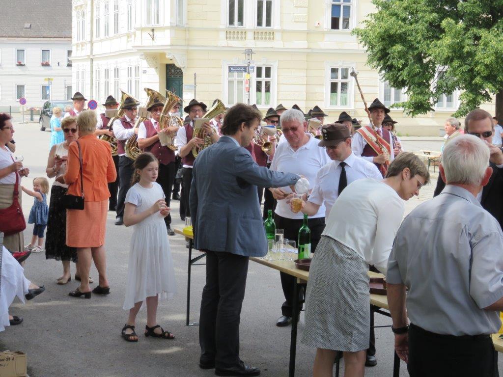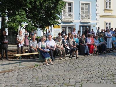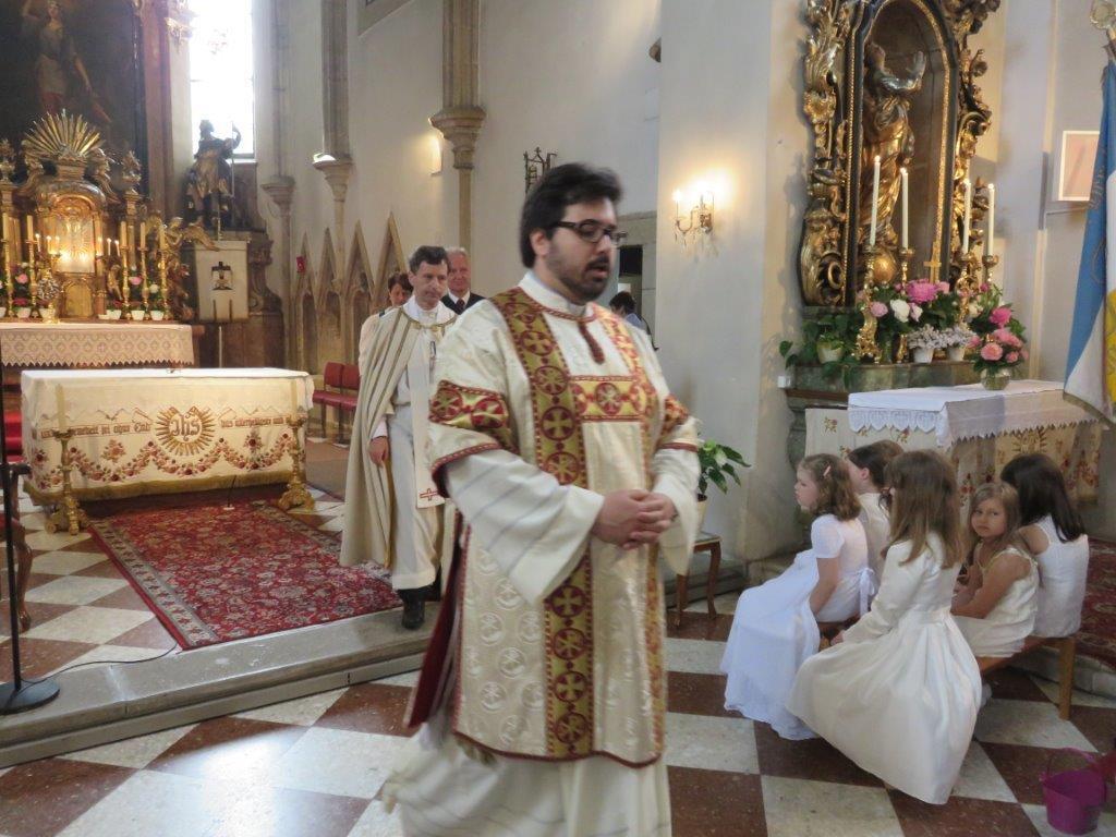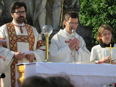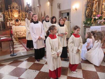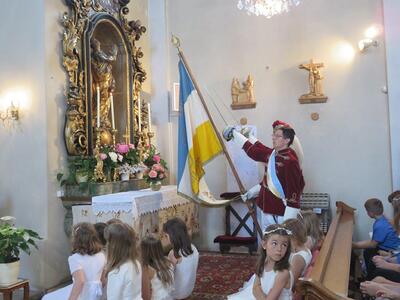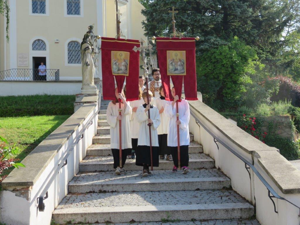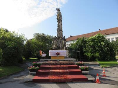 Am Sonntag, 29. Mai begangen wir das Fronleichnamsfest. Was wir an Fronleichnam feiern, ist die Freude darüber, dass Jesus wirklich unter uns gegenwärtig ist. Dazu schmückten wir die Fenster der Häuser am Wege der Prozession, daher zogen wir mit Musik, Gesang, mit Fahnen und festlicher Kleidung durch unsere Straßen. Deshalb nennen wir dieses Brot das „Allerheiligste“. Der Priester trug es in einer prächtigen Monstranz, unter dem „Himmel“, segnet damit unsere Gemeinde und alle Menschen, besonders die Kranken, Bedrängten und Notleidenden.