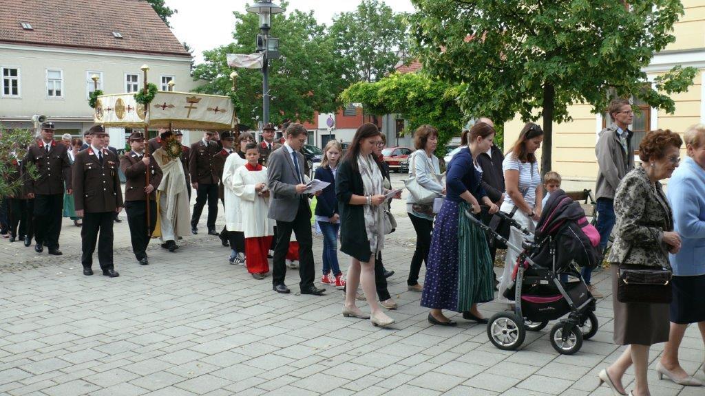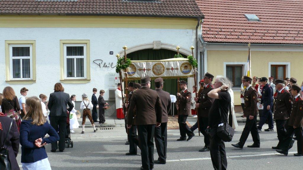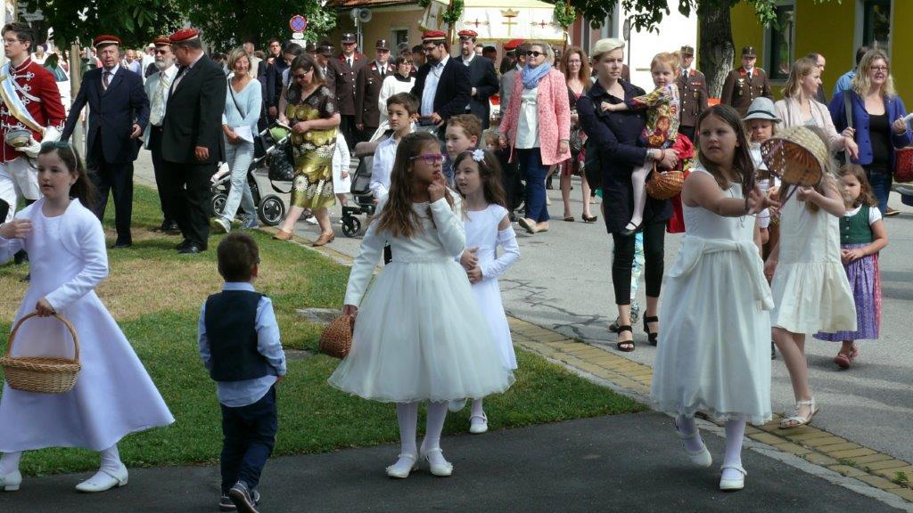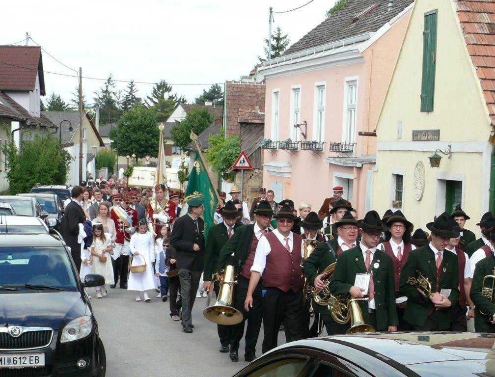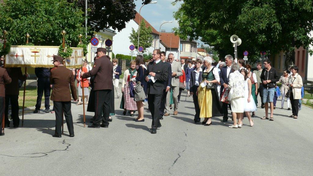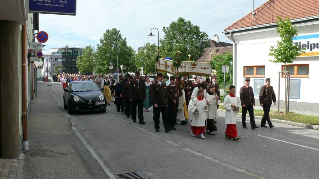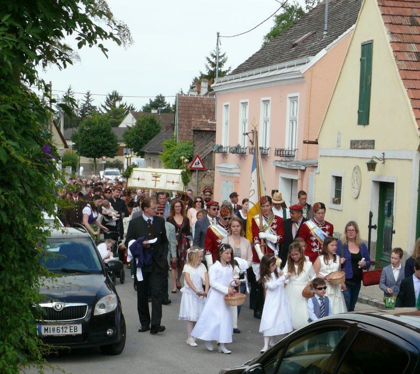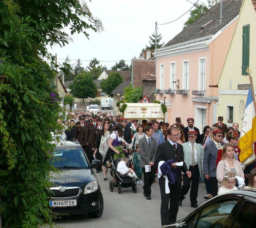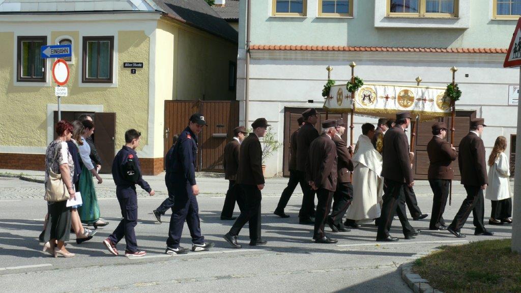 Bei schönem Wetter konnte die Monstranz mit dem Allerheiligsten begleitet von den Ministranten, den Erstkommunionskindern, den Blumenkindern, der Feuerwehr, der Blasmusik, der Studentenverbindung Herulia, den Hauerburschen mit der Hauerfahne, den Vertretern von Pfarre und Gemeinde, den Mitgliedern des Kameradschaftsbundes und den Gläubigen durch den Ort getragen werden.