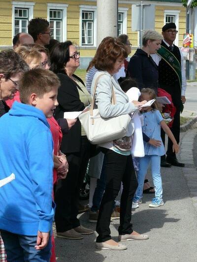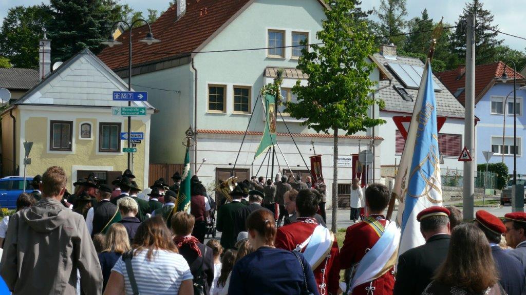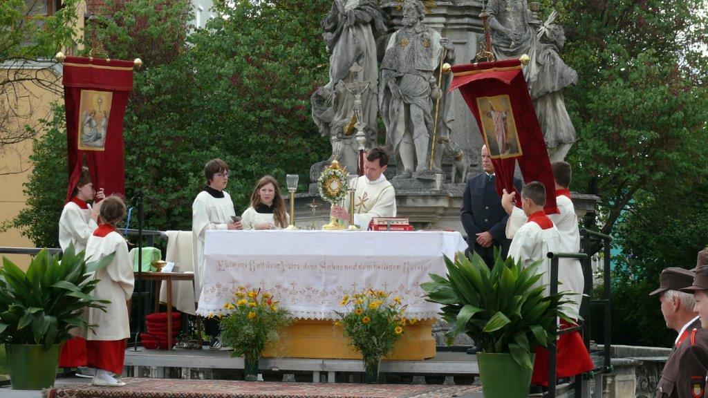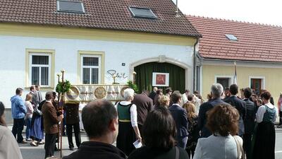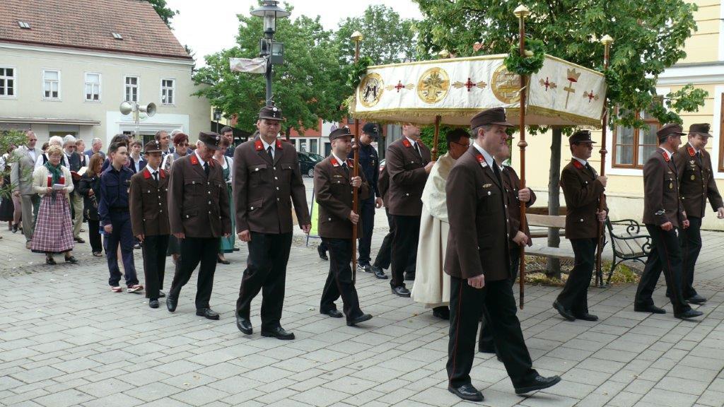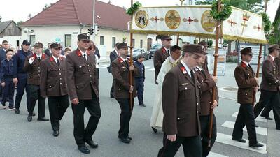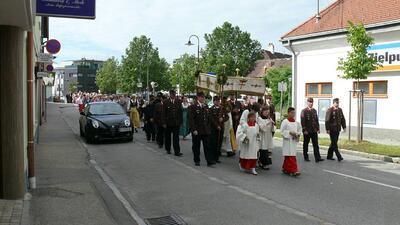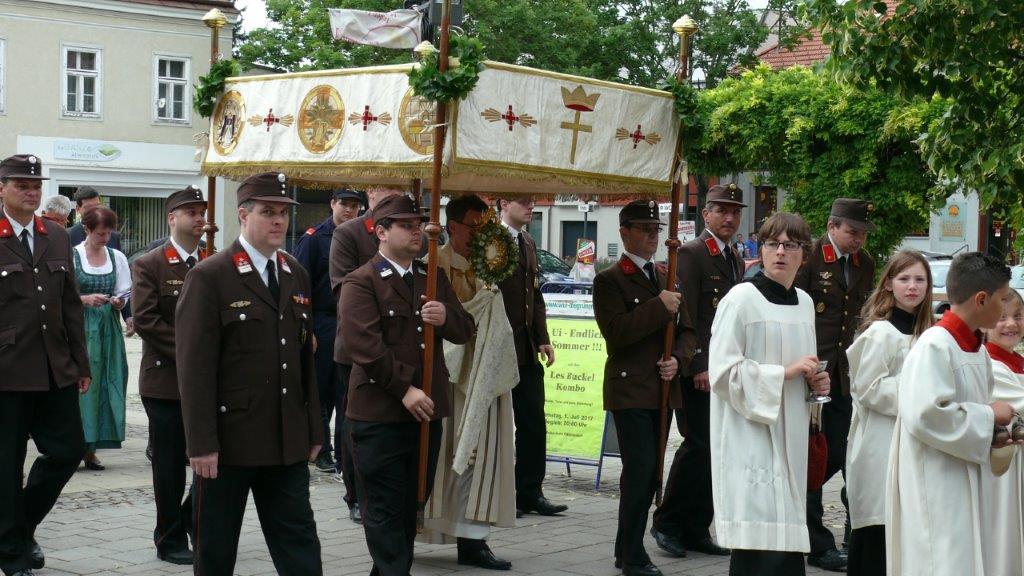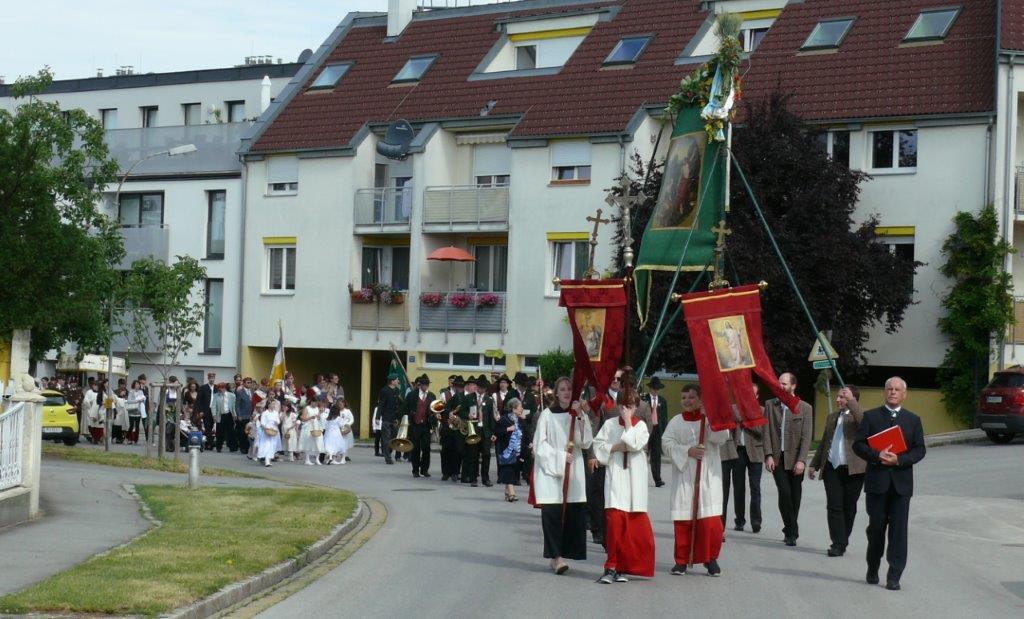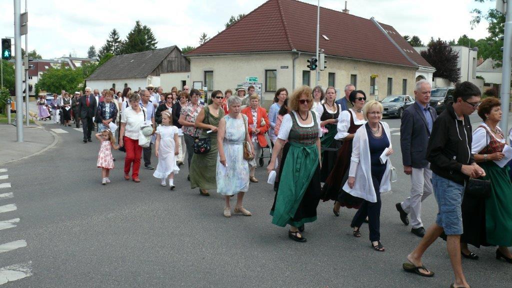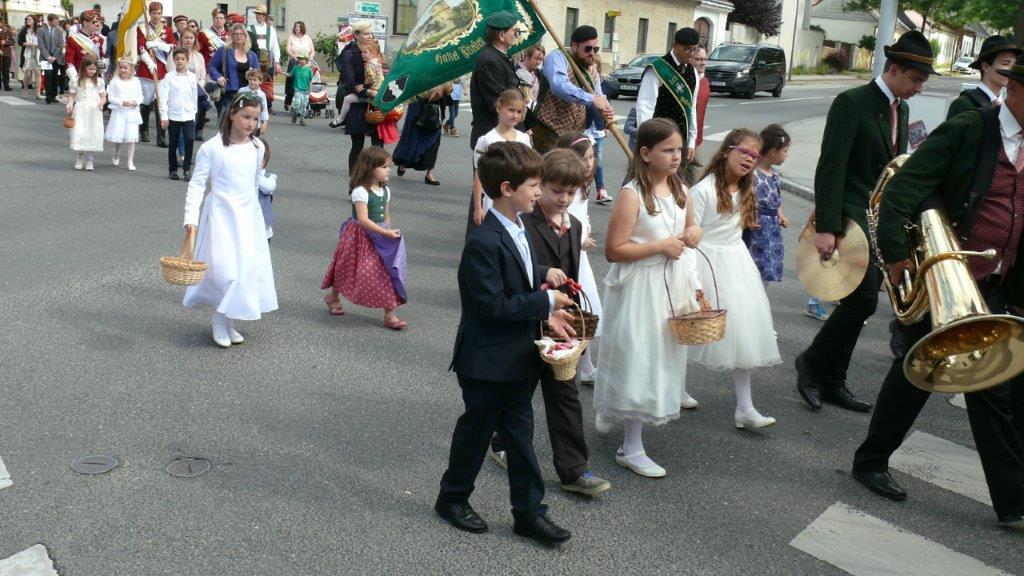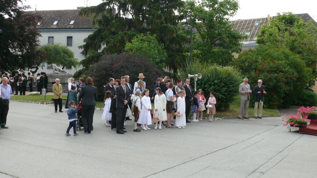 Bei schönem Wetter konnte die Monstranz mit dem Allerheiligsten begleitet von den Ministranten, den Erstkommunionskindern, den Blumenkindern, der Feuerwehr, der Blasmusik, der Studentenverbindung Herulia, den Hauerburschen mit der Hauerfahne, den Vertretern von Pfarre und Gemeinde, den Mitgliedern des Kameradschaftsbundes und den Gläubigen durch den Ort getragen werden.