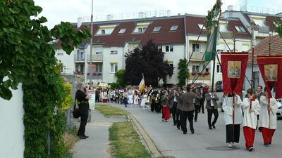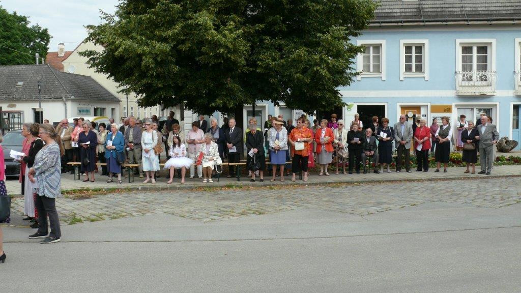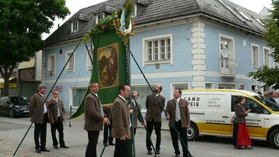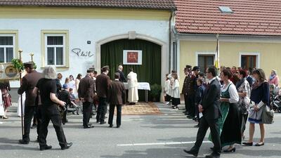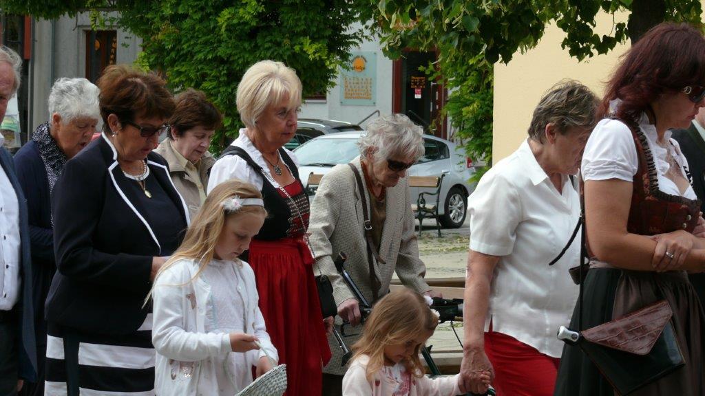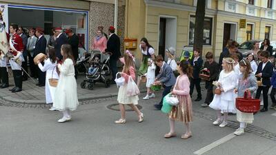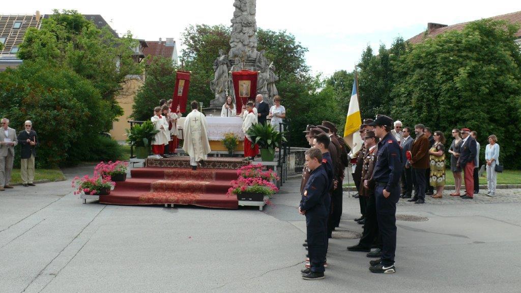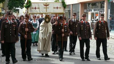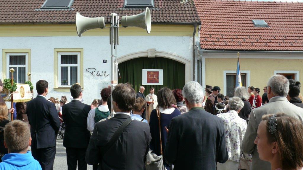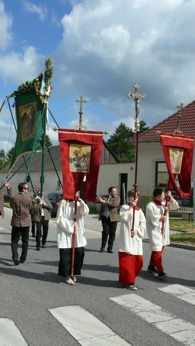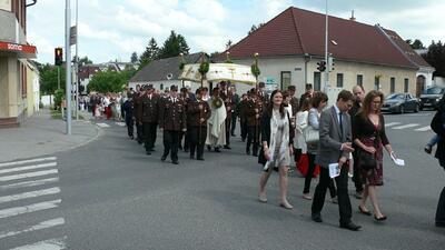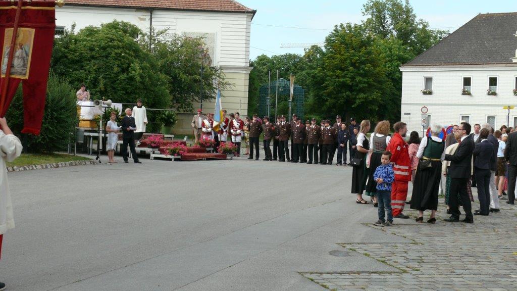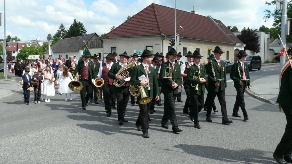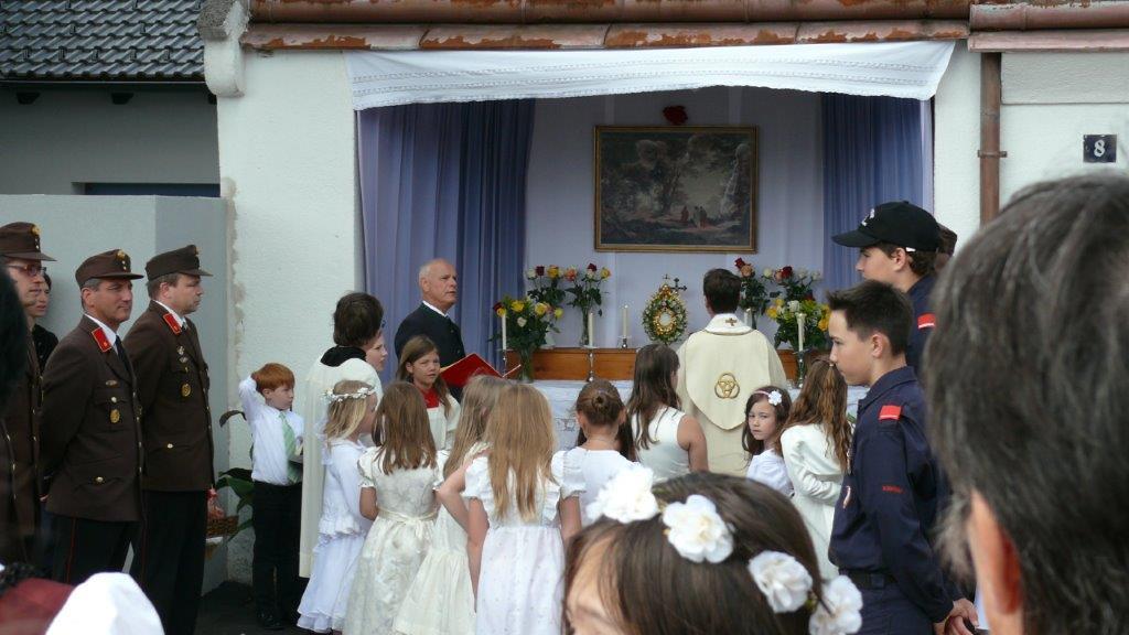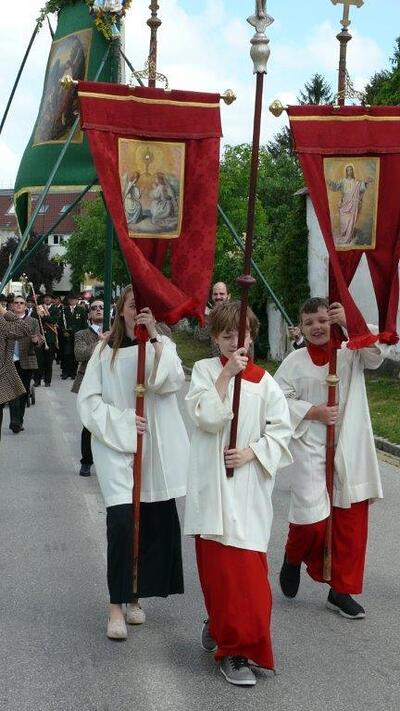 Bei schönem Wetter konnte die Monstranz mit dem Allerheiligsten begleitet von den Ministranten, den Erstkommunionskindern, den Blumenkindern, der Feuerwehr, der Blasmusik, der Studentenverbindung Herulia, den Hauerburschen mit der Hauerfahne, den Vertretern von Pfarre und Gemeinde, den Mitgliedern des Kameradschaftsbundes und den Gläubigen durch den Ort getragen werden.