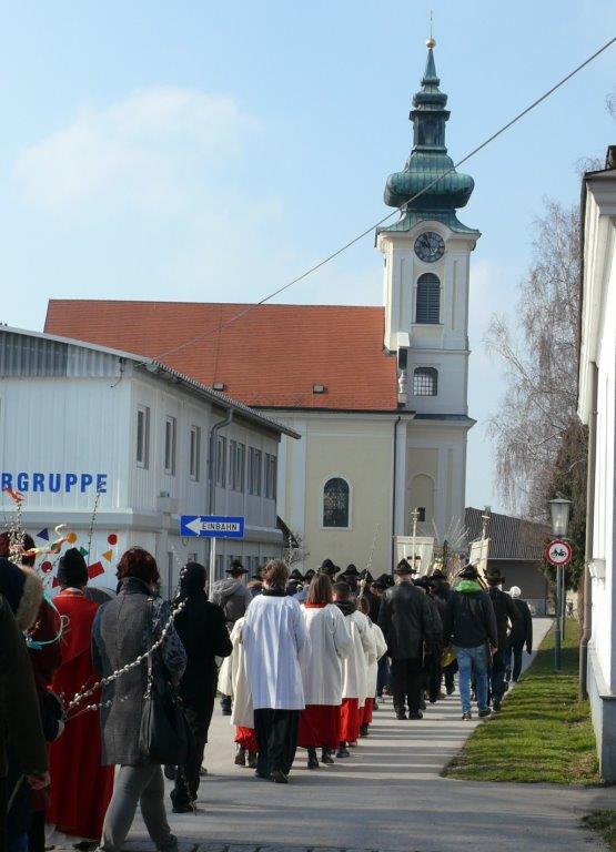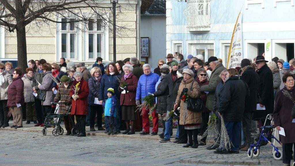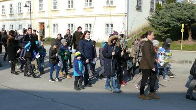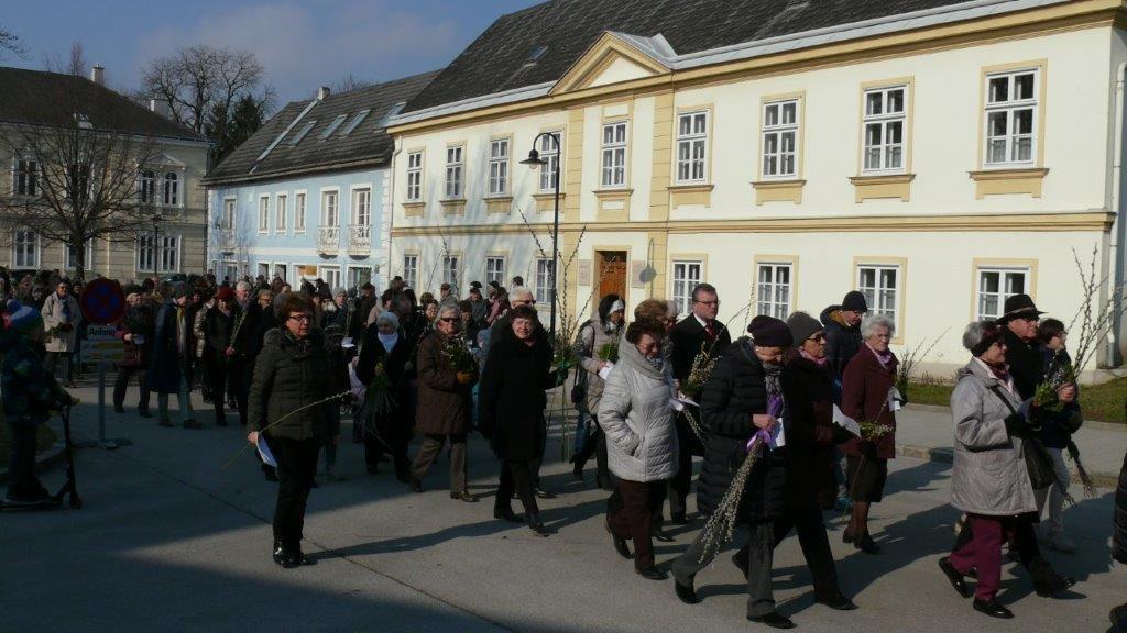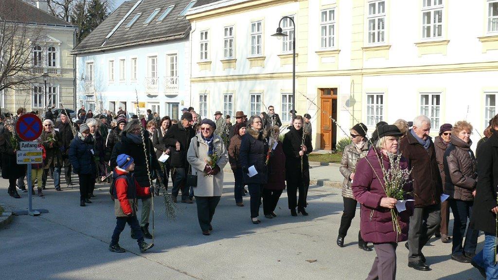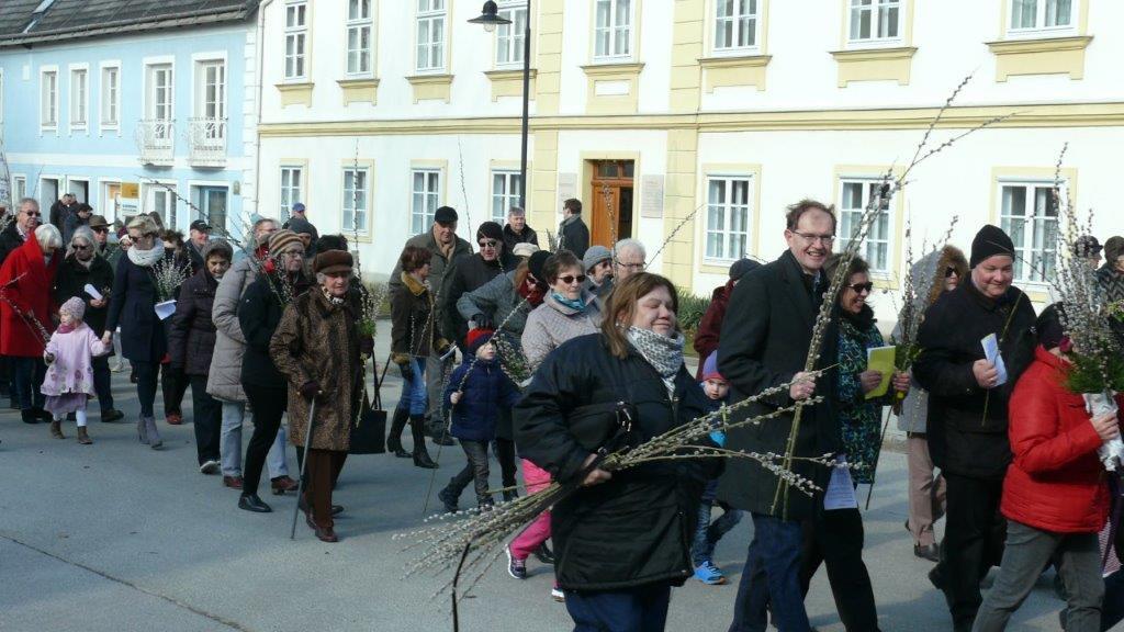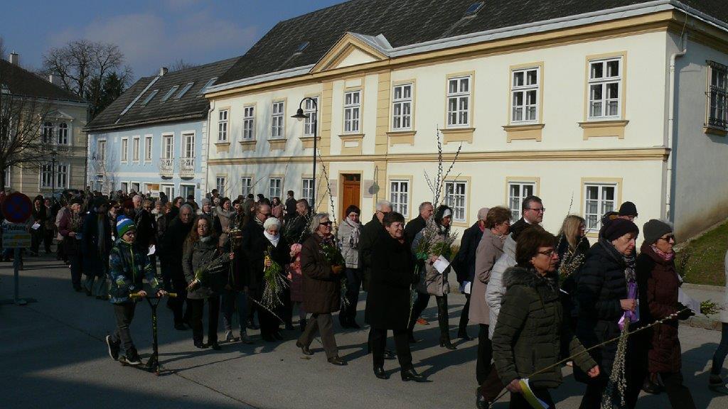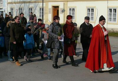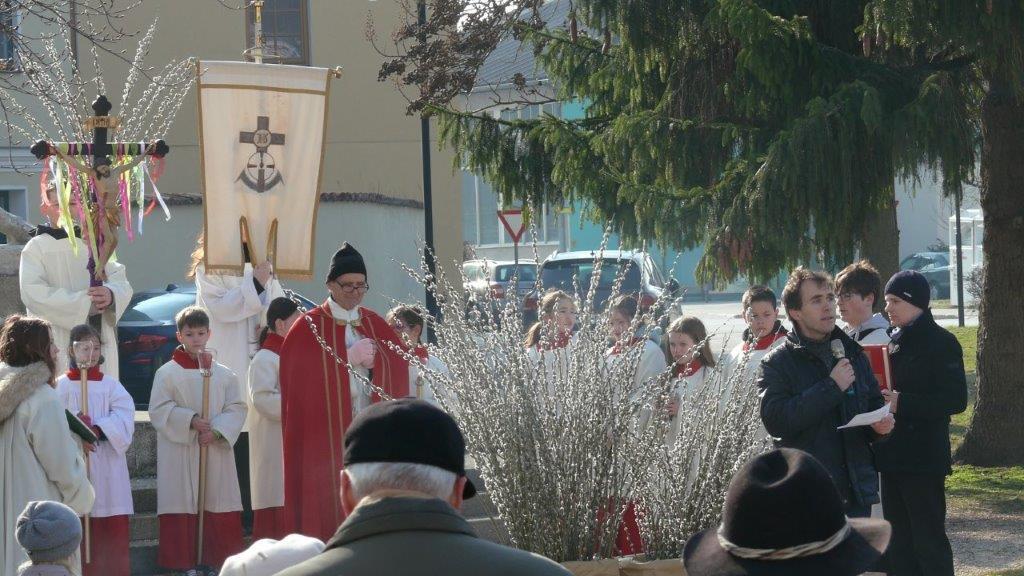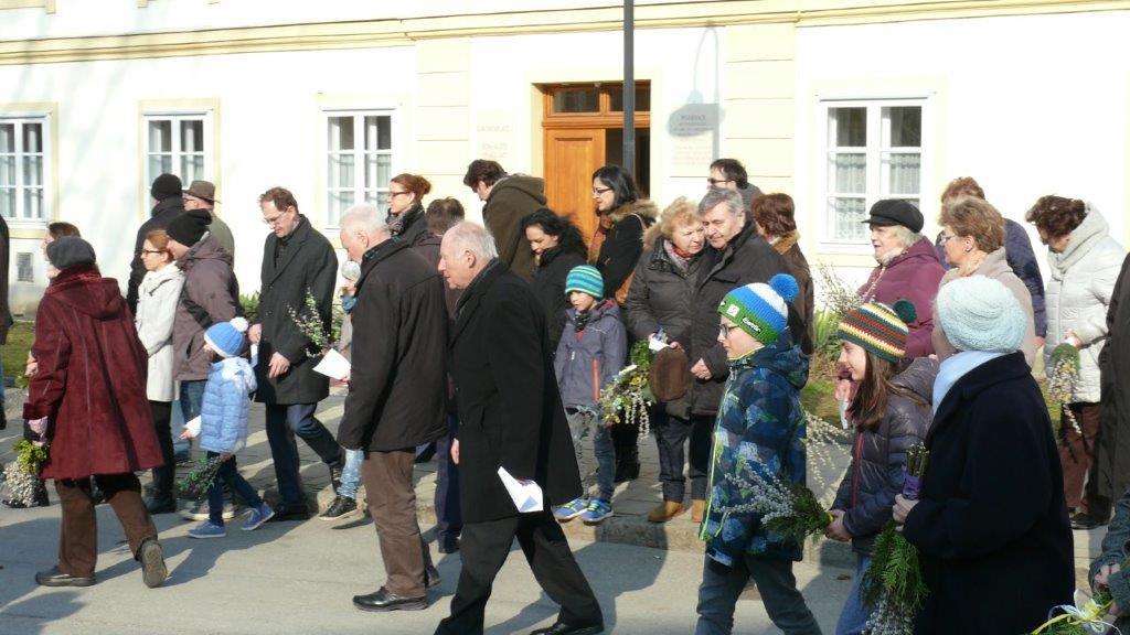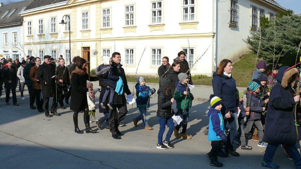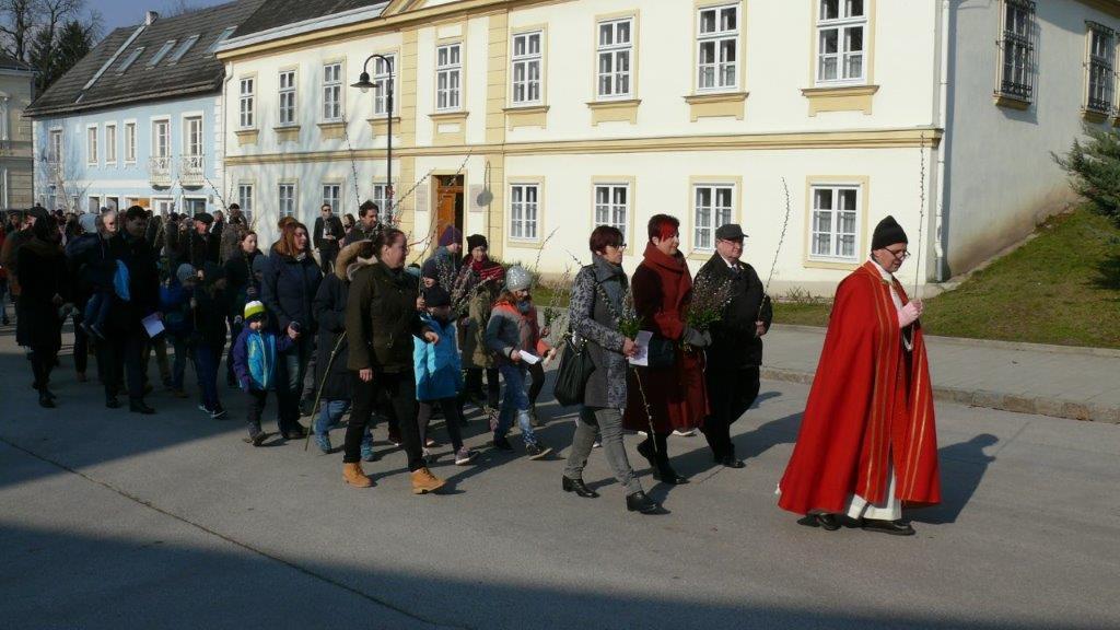 Zahlreiche Gläubige nahmen trotz Wind und Kälte am Palmsonntag an der Palmweihe am Kirchenplatz teil. Nach einem Umzug durch die Friedhofsgasse und einen kleinen Teil der Kaiser Josef-Straße feierten wir ein festliches Hochamt.