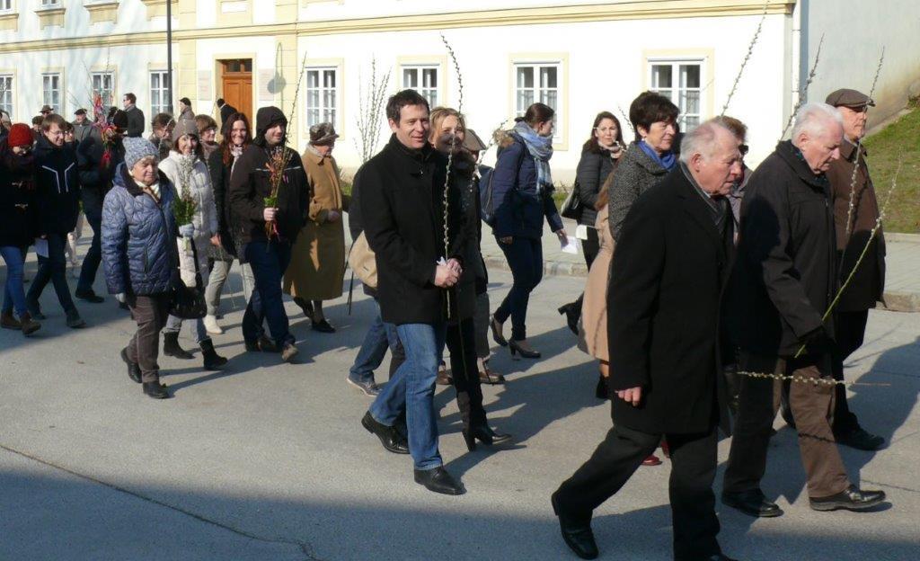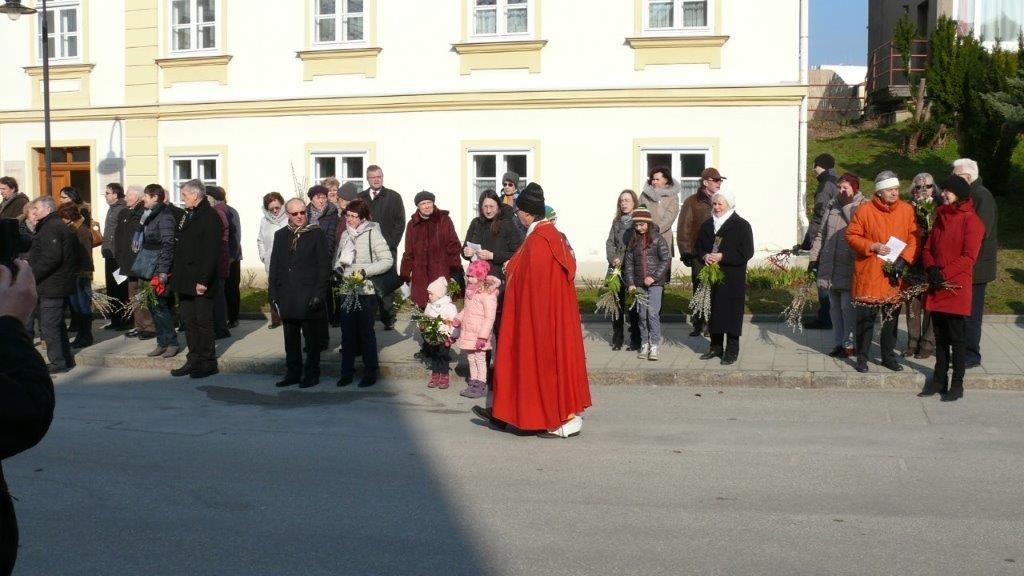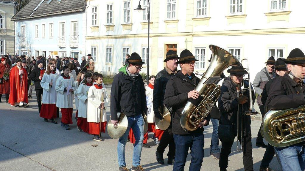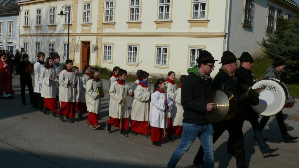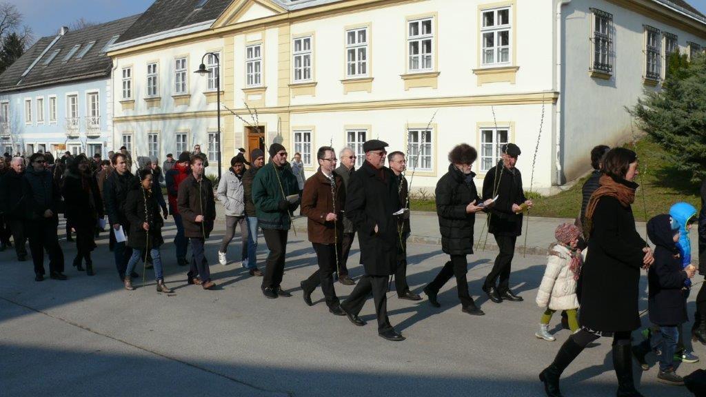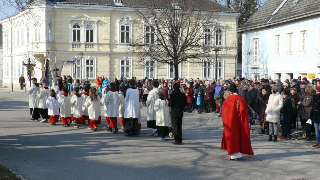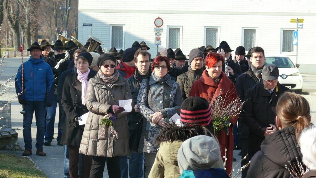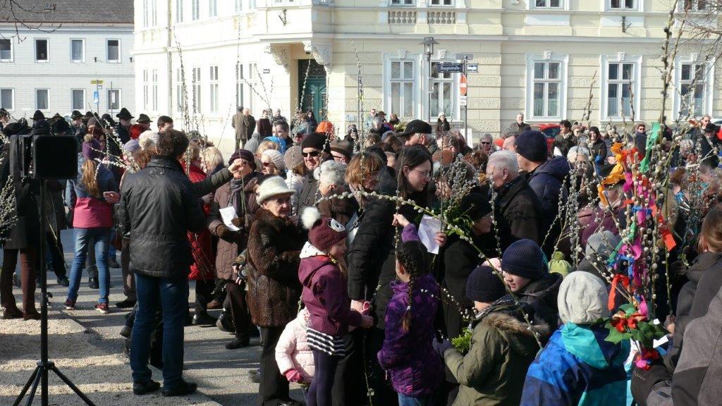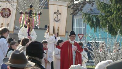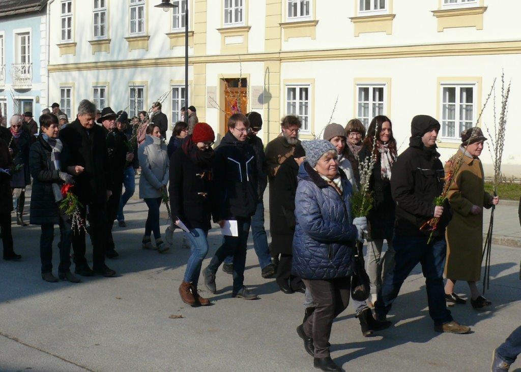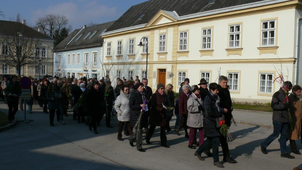 Zahlreiche Gläubige nahmen trotz Wind und Kälte am Palmsonntag an der Palmweihe am Kirchenplatz teil. Nach einem Umzug durch die Friedhofsgasse und einen kleinen Teil der Kaiser Josef-Straße feierten wir ein festliches Hochamt.