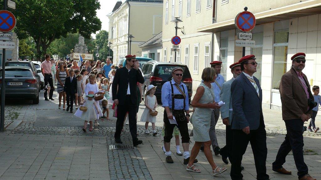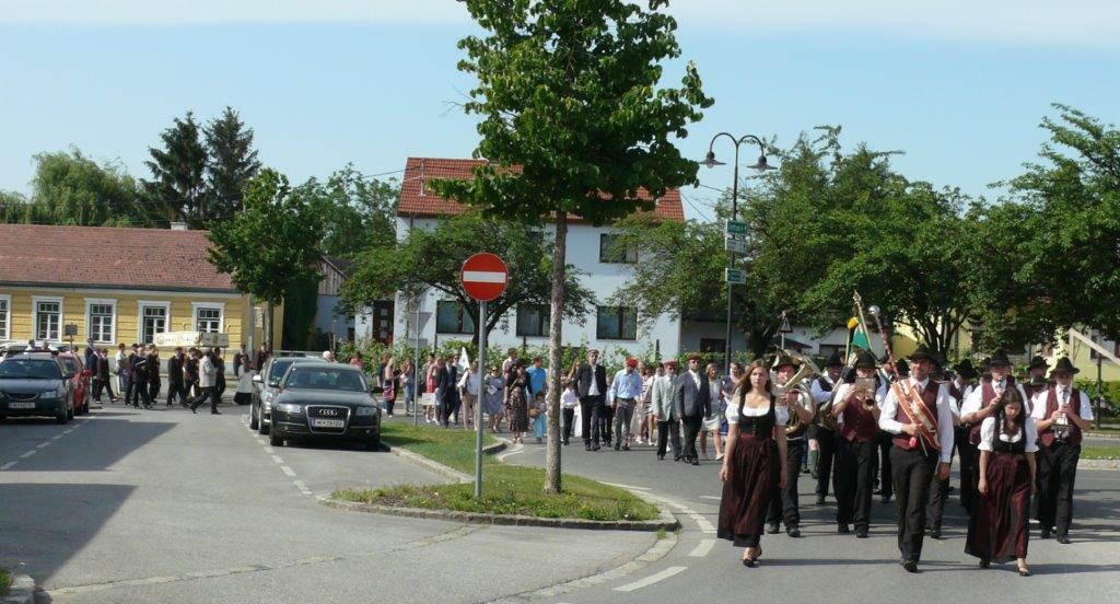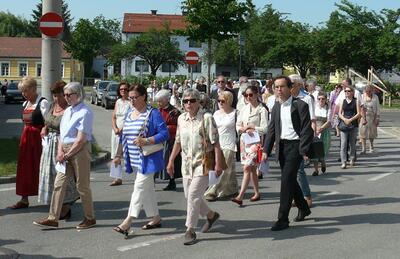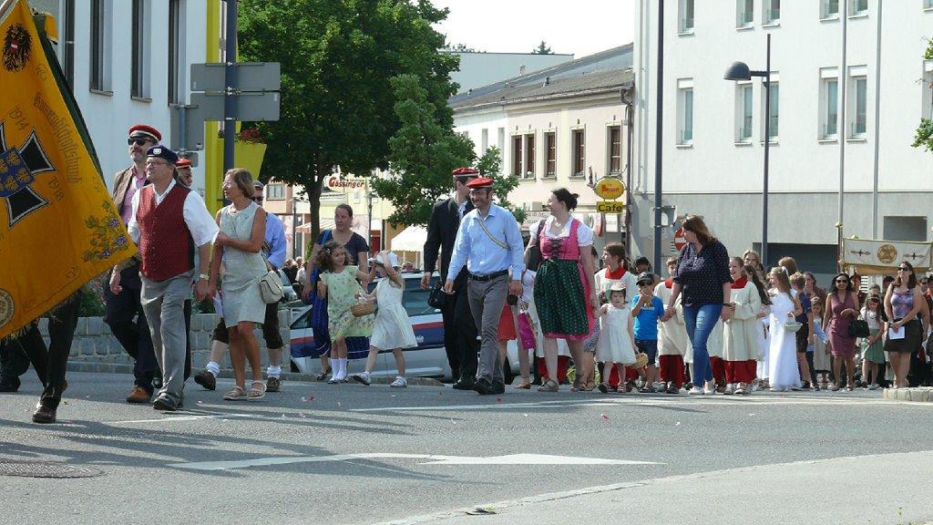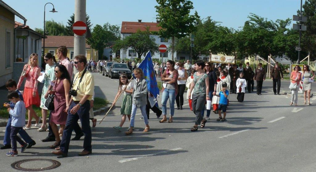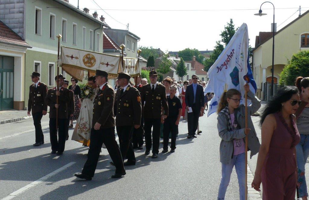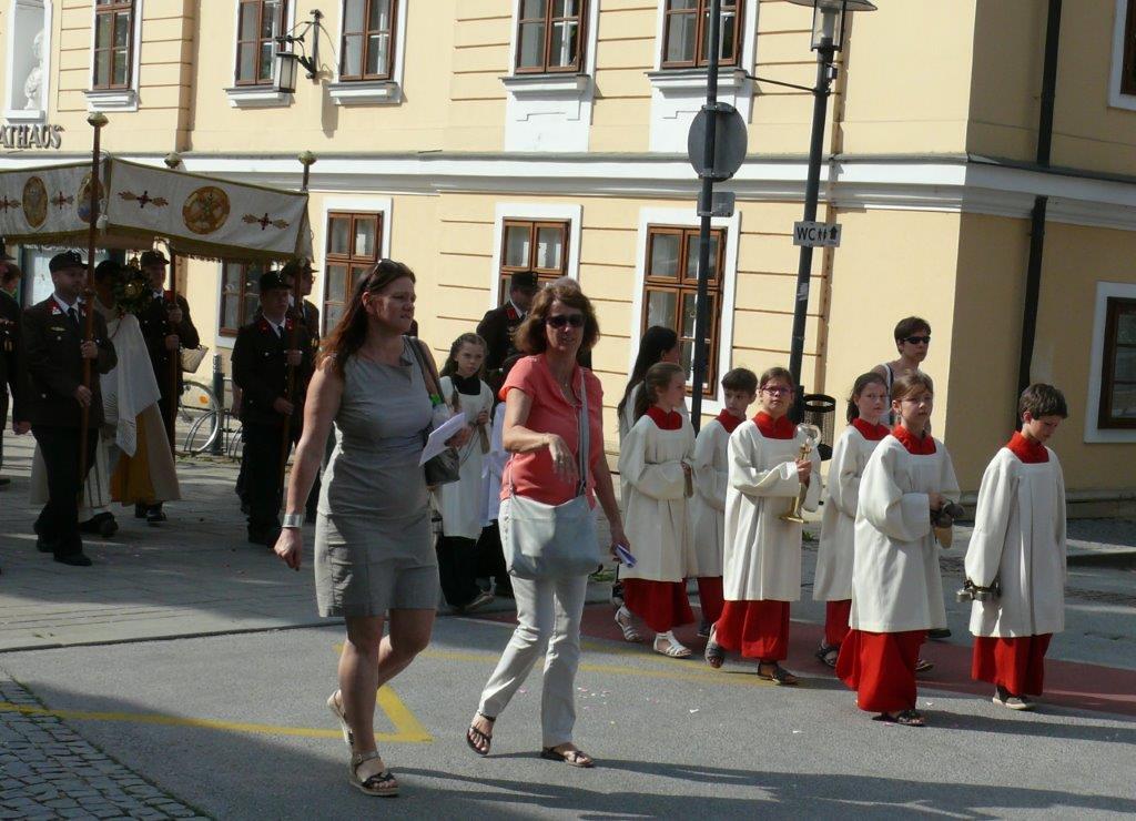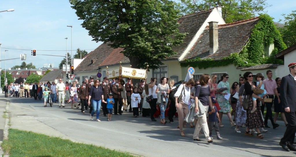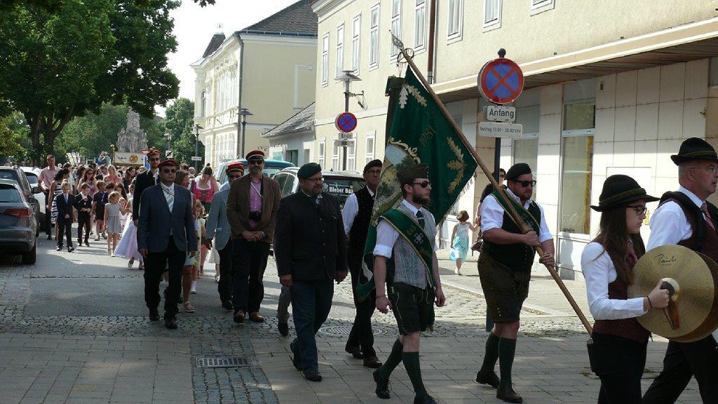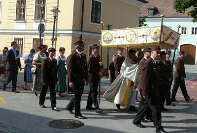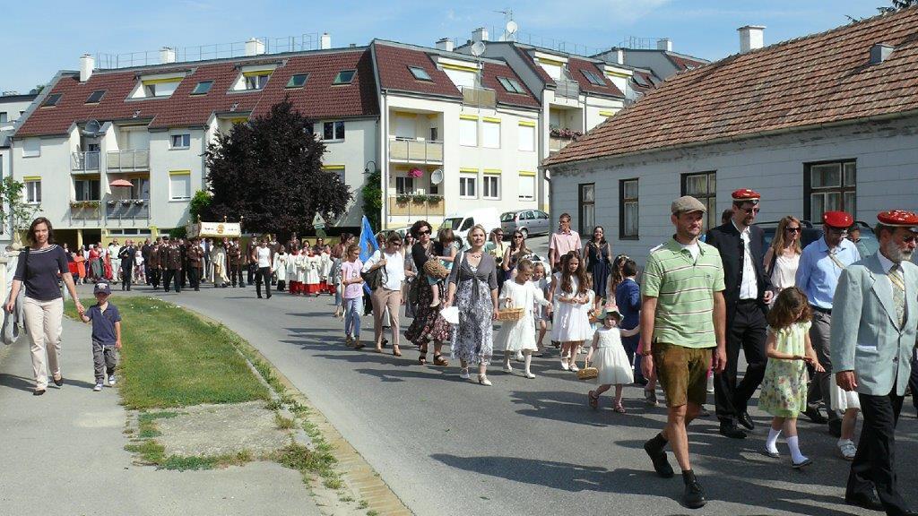 Auch heuer führte die Fronleichnamsprozession durch Hauptstraße, Adlergasse, Klostergasse und Kaiser Josef Straße zur Kirche. Eine Agape bei prächtigem Wetter rundete das festliche Ereignis ab.
