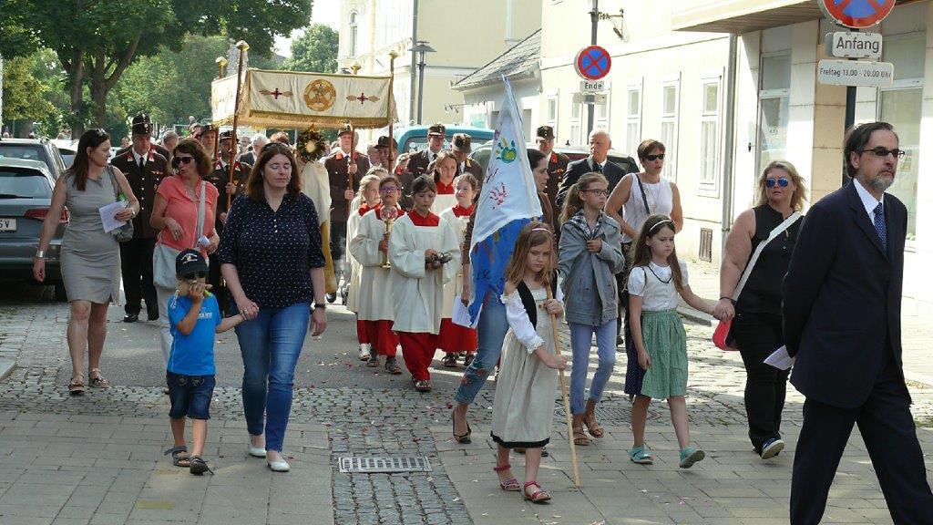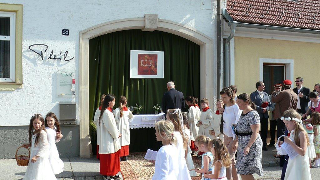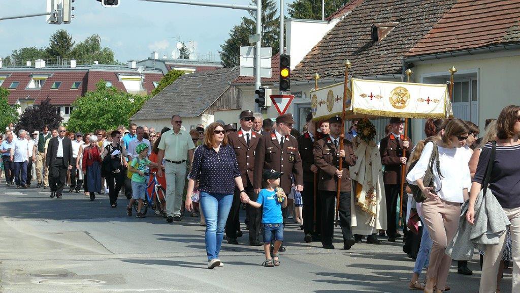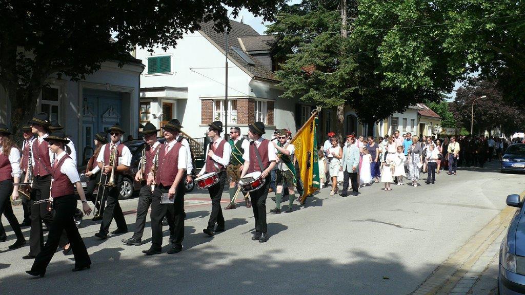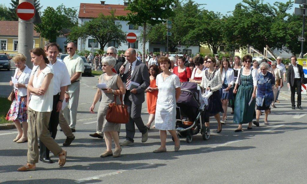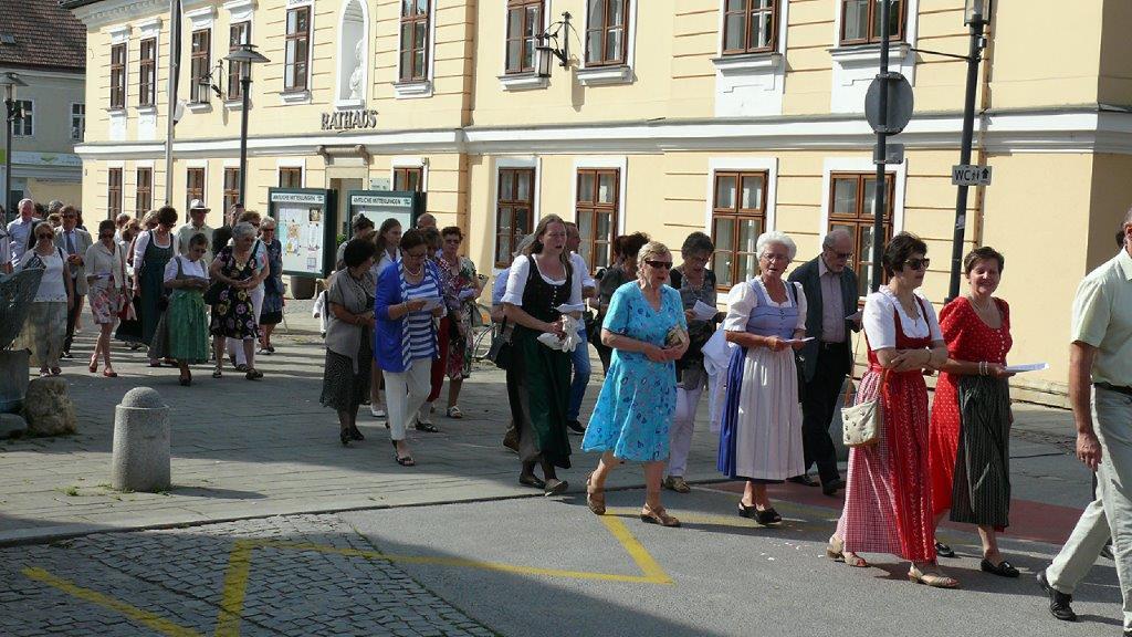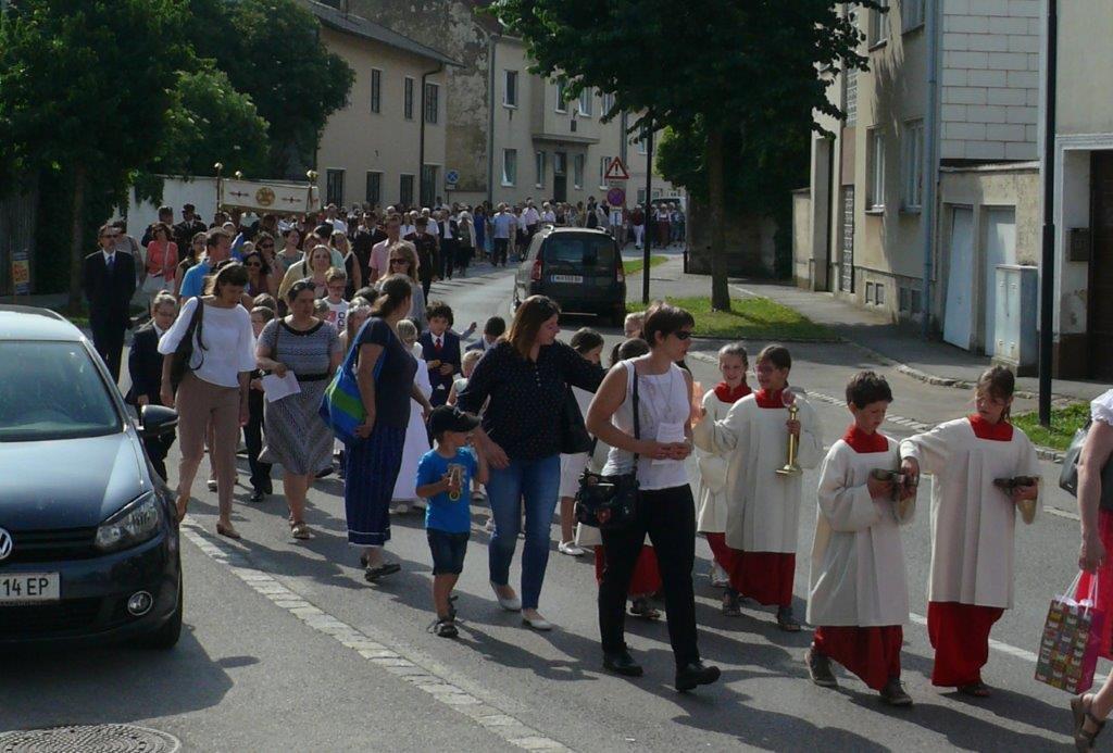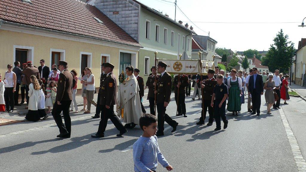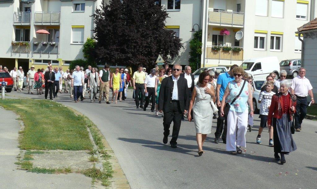 Auch heuer führte die Fronleichnamsprozession durch Hauptstraße, Adlergasse, Klostergasse und Kaiser Josef Straße zur Kirche. Eine Agape bei prächtigem Wetter rundete das festliche Ereignis ab.